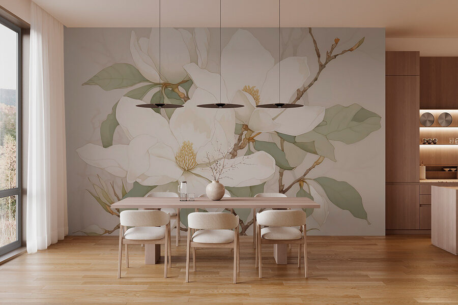 Proměňte každou místnost pomocí této úžasné nástěnné malby s bílými květinami. Představte si, že vejdete do svého prostoru a přivítají vás jemné, klidné květy, které jako by téměř šeptaly klid. Jemné okvětní lístky a něžná zeleň vytvářejí atmosféru, která je osvěžující a uklidňující – ideální pro útulný čtecí koutek nebo klidné útočiště v ložnici.