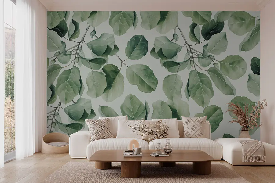Proměňte jakýkoli prostor v klidné útočiště pomocí této nástěnné malby se svěžími zelenými listy. Představte si, že vstoupíte do klidného lesa – tento design tento pocit dokonale vystihuje. Jemný listový vzor zve závan čerstvého vzduchu přímo do vašeho domova, takže budete chtít zout boty a relaxovat. Jako by se příroda rozhodla být vaší tapetou a zahalila vás do tepla a klidu. Tato fototapeta se skvěle hodí do útulného obývacího pokoje nebo klidné kanceláře, kde pozvedne atmosféru, aniž by byla příliš vyumělkovaná. Kdo potřebuje dovolenou, když může mít kousek přírody doma?