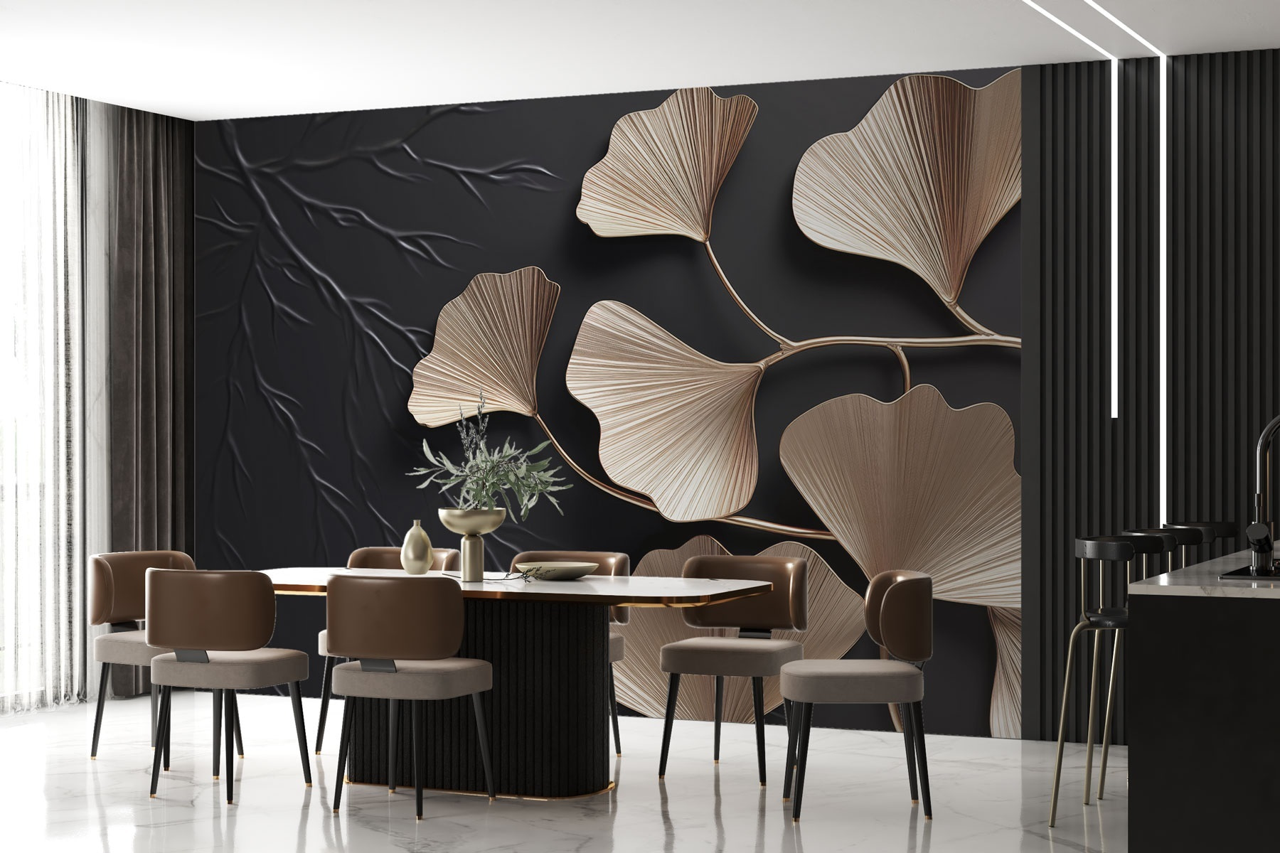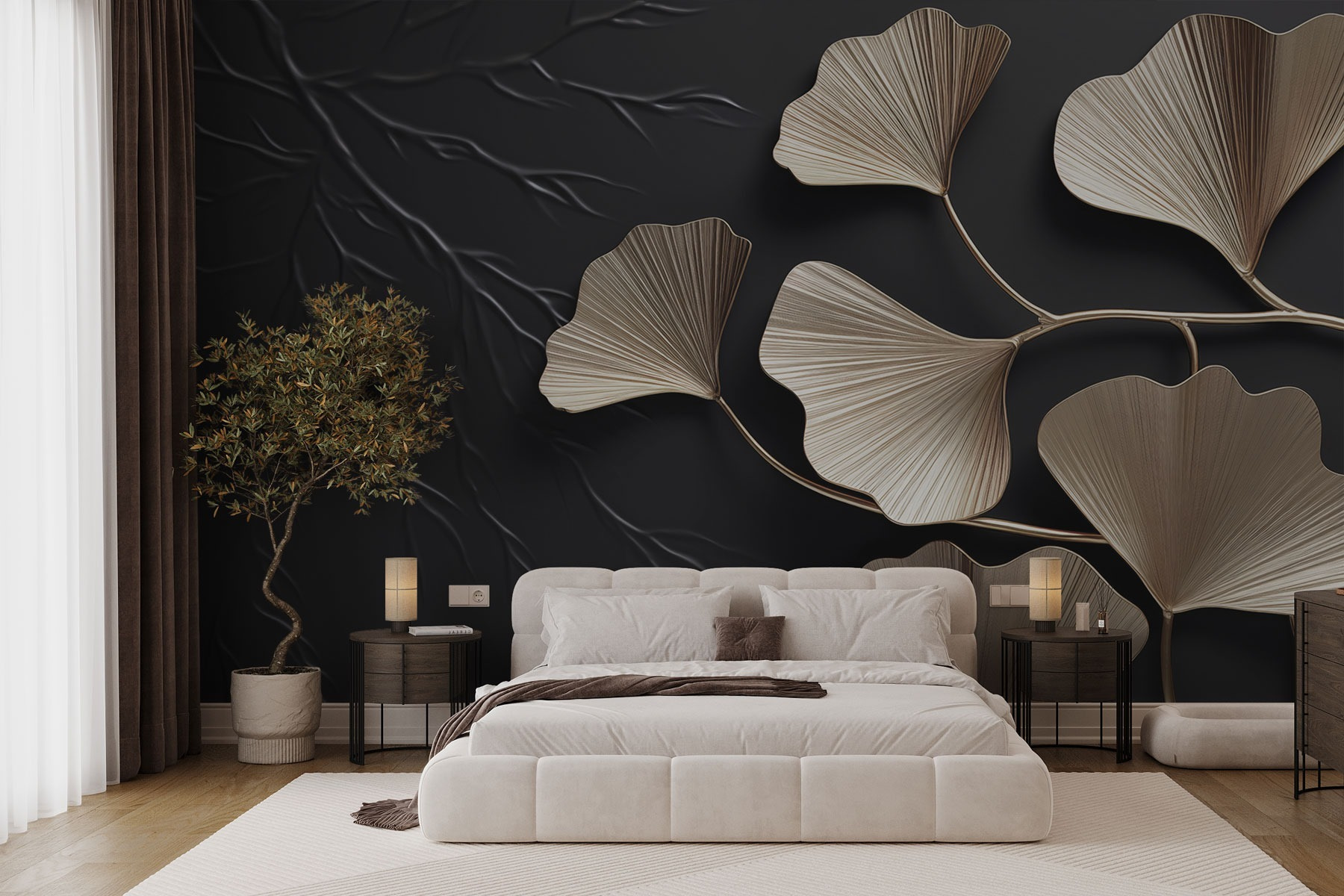 Proměňte svůj prostor pomocí této výrazné nástěnné malby s uměleckými listy ginkga na jedinečném pozadí. Představte si, jak se probouzíte a vaše stěny objímají jemné přírodní tóny listí. Dodá vám dotek přírody, který bude nutit hosty obdivovat váš styl. Půvabné listy jako by tančily a vytvářely uklidňující atmosféru ideální pro útulný čtecí koutek nebo živou jídelnu. Navíc se snadno aplikuje – ideální pro ty, kteří mají rádi rychlou změnu vzhledu bez nepořádku. Tato nástěnná malba může inspirovat k několika hlubokým nádechům a snění. Kdo by to nechtěl?