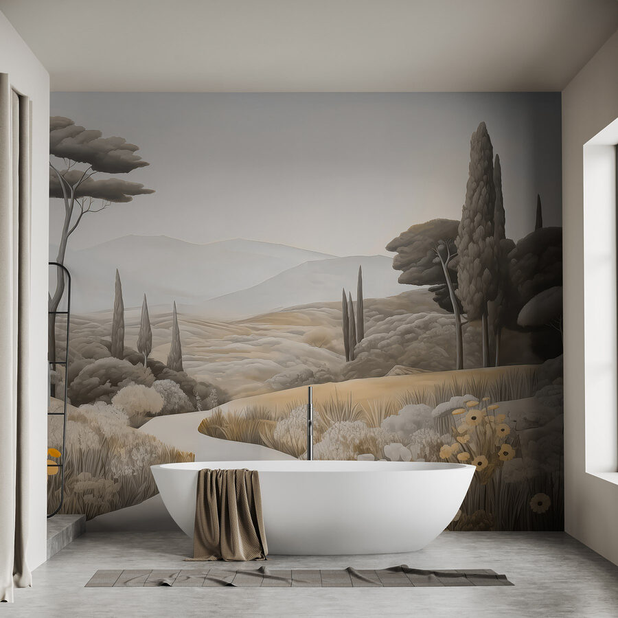 Proměňte svůj prostor pomocí této úžasné nástěnné malby “Krajina s klikatou silnicí a stromy”. Oživuje klidnou krajinu a zve přírodu do interiéru bez venkovního nepořádku. Představte si, jak v líné neděli popíjíte kávu a přitom se díváte na mírné kopce a pohupující se stromy – je to jako mini dovolená přímo na vaší zdi. Tato nástěnná malba, ideální pro tyto zasněné chvíle, zahalí váš pokoj do teplých, zemitých tónů a jemných detailů, které vás donutí zhluboka dýchat. Šeptá relaxaci a připomíná vám klidné procházky pod širým nebem. Jen si představte rozhovory, které by mohla vyvolat, nebo klidné vibrace, které přináší – jaký sladký dotek pro každý kout!