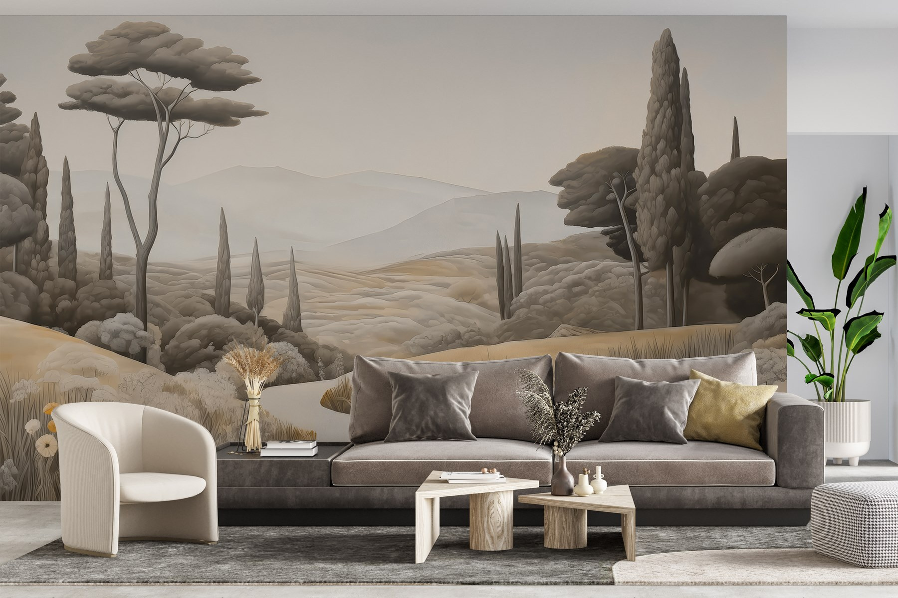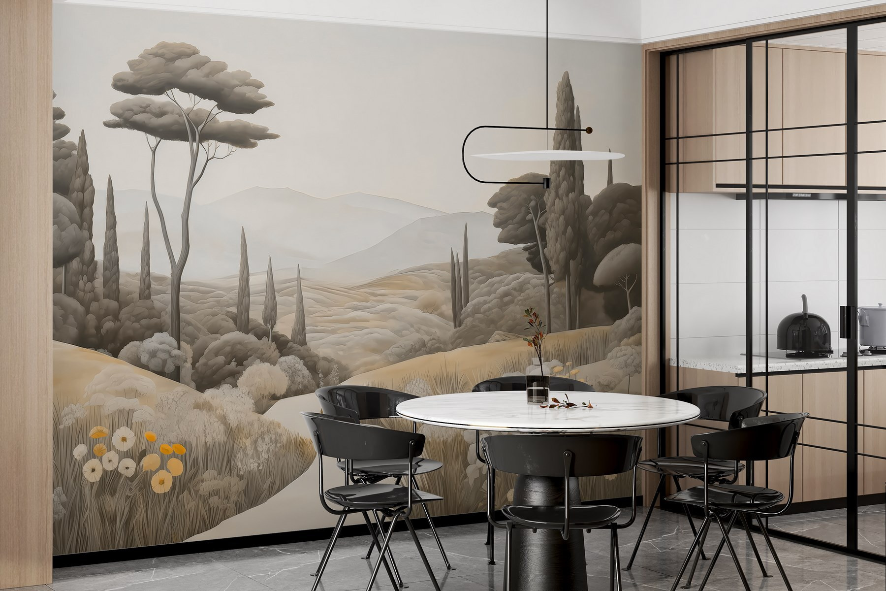 Proměňte svůj prostor pomocí této úžasné nástěnné malby “Krajina s klikatou silnicí a stromy”. Oživuje klidnou krajinu a zve přírodu do interiéru bez venkovního nepořádku. Představte si, jak v líné neděli popíjíte kávu a přitom se díváte na mírné kopce a pohupující se stromy – je to jako mini dovolená přímo na vaší zdi. Tato nástěnná malba, ideální pro tyto zasněné chvíle, zahalí váš pokoj do teplých, zemitých tónů a jemných detailů, které vás donutí zhluboka dýchat. Šeptá relaxaci a připomíná vám klidné procházky pod širým nebem. Jen si představte rozhovory, které by mohla vyvolat, nebo klidné vibrace, které přináší – jaký sladký dotek pro každý kout!