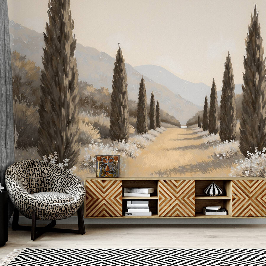 Proměňte svůj prostor v klidné útočiště s touto okouzlující nástěnnou malbou s klidnou krajinou vysokých stromů a jemných květin. Je to jako vstoupit do zasněné přírodní scény přímo z vašeho obývacího pokoje. Představte si, jak popíjíte čaj a díváte se na tu krásnou cestu lemovanou veselými květy – okamžitý klid! Zemité tóny vytvářejí hřejivou atmosféru a bez námahy se hodí k jakémukoli interiéru. Ideální pro ty, kteří chtějí dotek přírody, aniž by museli opustit domov. Jen si představte, jaké rozhovory by tato nástěnná malba mohla vyvolat; mohla by dokonce inspirovat sny o dlouhých, líných procházkách sluncem ozářenou zahradou. Perfektní volba pro vnesení trochy klidu a charakteru do každé místnosti!