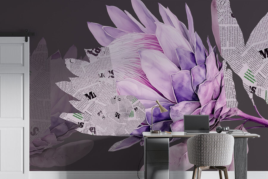 Proměňte svůj prostor pomocí této výrazné nástěnné malby, která zobrazuje úžasnou fialovou květinu propletenou útržky novin. Je to jako mít umělecké dílo, které zároveň šeptá příběhy z minulosti. Představte si, že vejdete do místnosti a přivítá vás tento živý květ – není to jen dekorace, je to zážitek. Tato nástěnná malba vnáší do každé stěny špetku kreativity a dodává jí nádech rozmarnosti. Je ideální pro ty, kdo oceňují krásu přírody a kouzlo vintage tisku, a vytváří příjemnou atmosféru, která podněcuje konverzaci. S každým pohledem působí ve vašem domově jako závan čerstvého vzduchu.