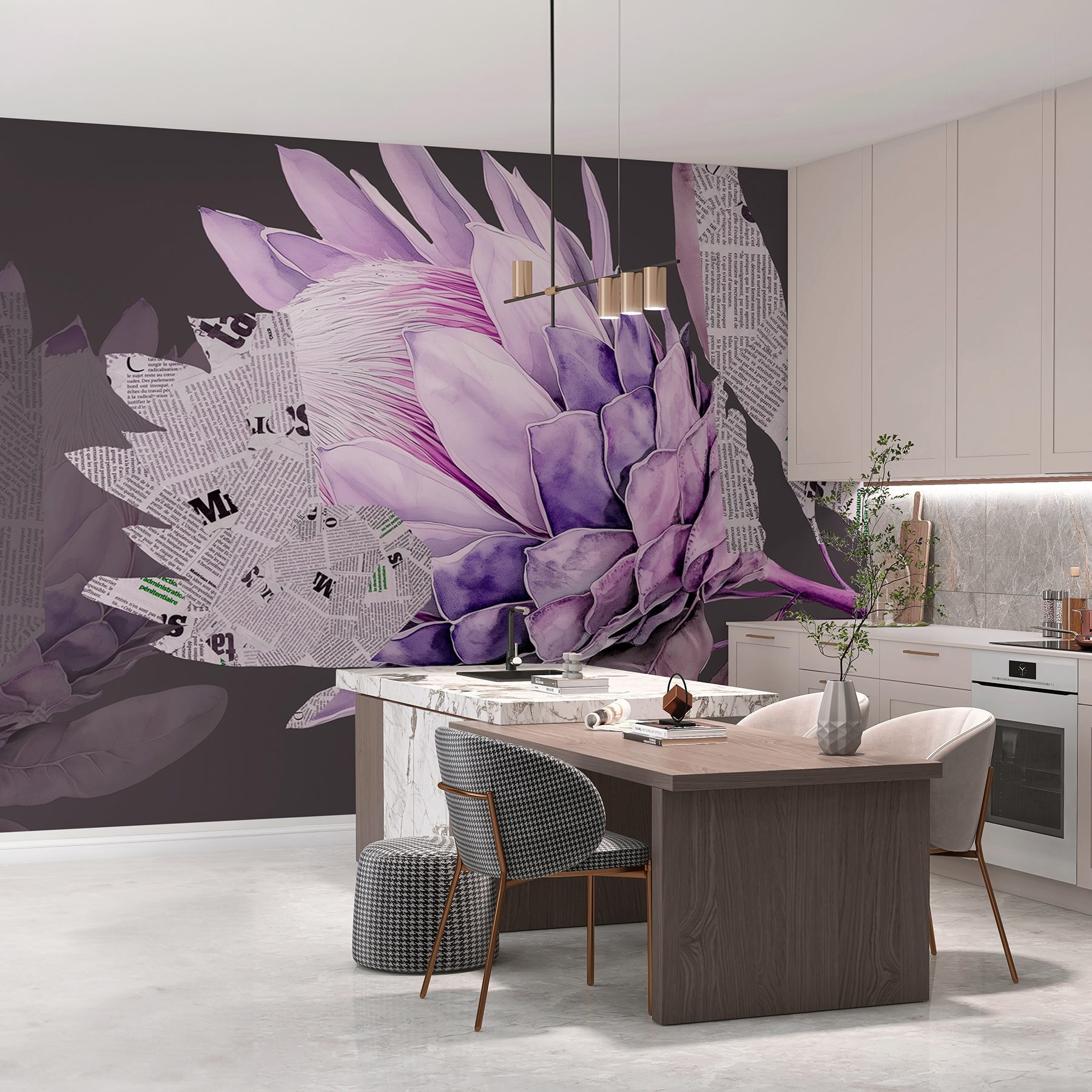 Proměňte svůj prostor pomocí této výrazné nástěnné malby, která zobrazuje úžasnou fialovou květinu propletenou útržky novin. Je to jako mít umělecké dílo, které zároveň šeptá příběhy z minulosti. Představte si, že vejdete do místnosti a přivítá vás tento živý květ – není to jen dekorace, je to zážitek. Tato nástěnná malba vnáší do každé stěny špetku kreativity a dodává jí nádech rozmarnosti. Je ideální pro ty, kdo oceňují krásu přírody a kouzlo vintage tisku, a vytváří příjemnou atmosféru, která podněcuje konverzaci. S každým pohledem působí ve vašem domově jako závan čerstvého vzduchu.