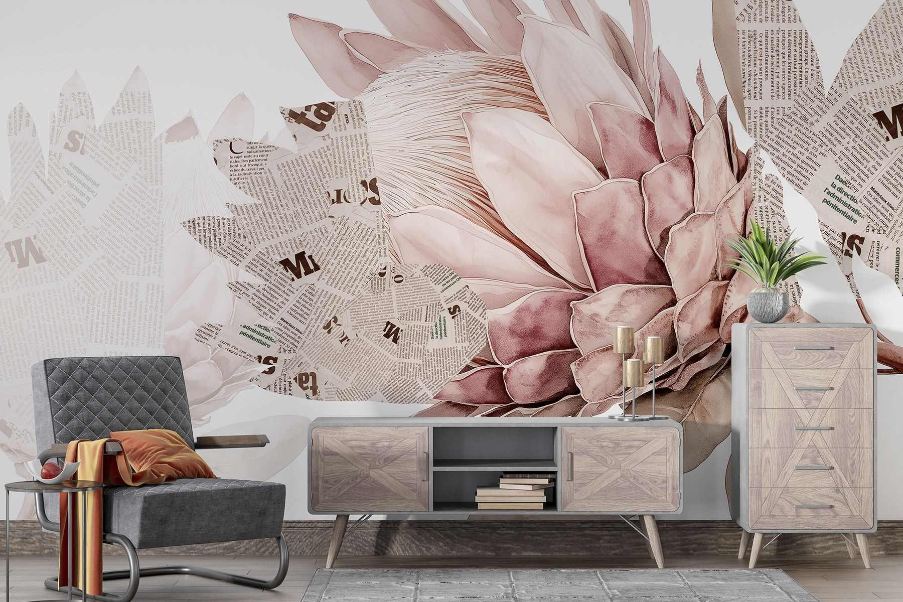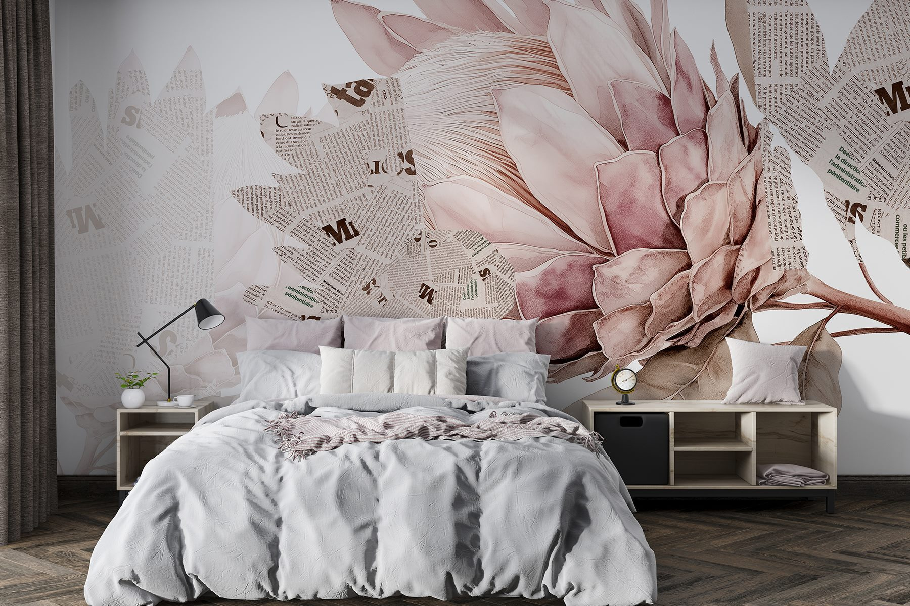 Vneste do interiéru dotek přírody s touto okouzlující fototapetou s nádhernými květy propletenými s novinovými prvky. Je to jako kombinace zahradní slavnosti a umělecké galerie, a to vše na vaší zdi. Představte si, jak popíjíte kávu a přitom obdivujete, jak jemné okvětní lístky tančí s tučným textem, což vyvolává konverzaci a možná i trochu snění. Tato nástěnná malba dokáže proměnit každou místnost v útulné zákoutí, které působí živě, a přitom stylově. Šeptá do duše, zve k hřejivosti a nádechu rozmarnosti. Perfektně se hodí do prostor, které touží po osobnosti a šarmu, a je jemnou připomínkou toho, že krásu lze nalézt na nečekaných místech.