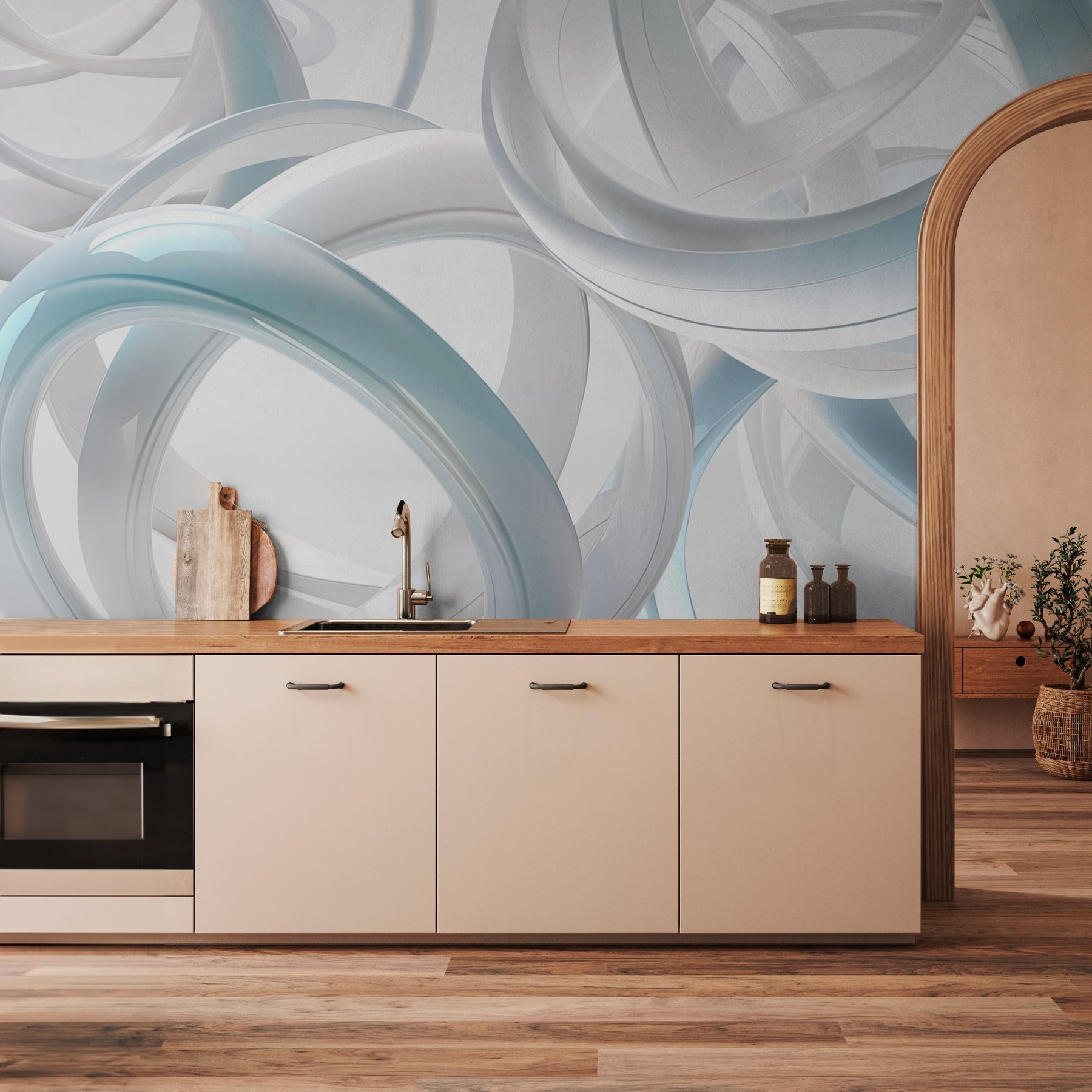 Proměňte svůj prostor pomocí této výrazné nástěnné malby s hravým tancem bílých kroužků. Je to jako přenést si kus moderního umění přímo do obývacího pokoje! Představte si, jak upoutá pozornost každého hosta – jako přátelský začátek konverzace, který nenápadně říká: “Ano, tady bydlím.” Překrývající se tvary vytvářejí pocit hloubky, takže místnost působí rozlehlejším dojmem. Ideální pro útulný čtecí koutek nebo třeba živou kancelář. Vzdušná atmosféra vám navíc může zvednout náladu, takže každý den bude o něco lehčí. Kdo by řekl, že nástěnná malba může zlepšit náladu? Jen si to představte – měkké, plynulé křivky, které vás vybízejí k malému snění.
