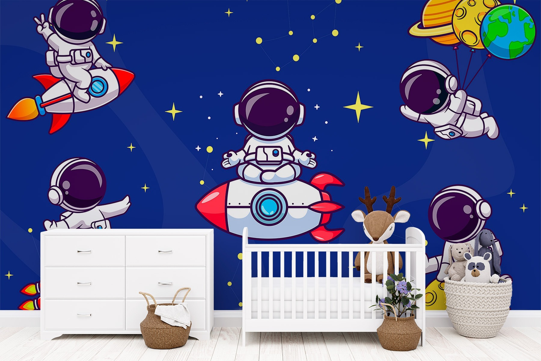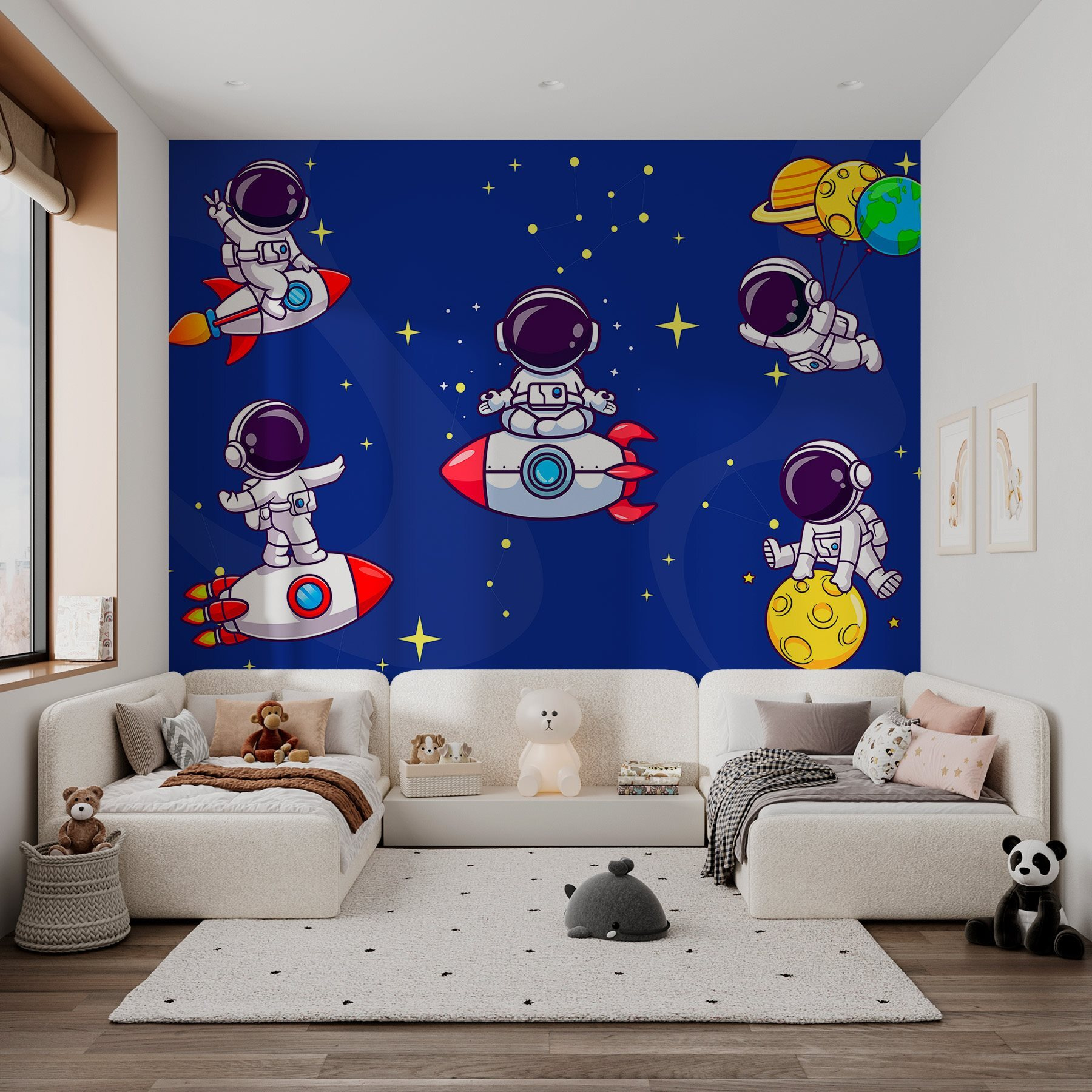 Odstartujte do galaxie plné zábavy s touto rozmarnou fototapetou s kreslenými astronauty plujícími vesmírem. Představte si, že vstoupíte do místnosti, kde malí průzkumníci mávají z raket, odpočívají na Měsíci a stylově zdolávají vesmír. Tato fototapeta, která se skvěle hodí do dětského pokoje nebo hravého obývacího pokoje, vybízí ke snění o mezihvězdných dobrodružstvích a hvězdných nocích. Je jako vstupenka do vesmíru, aniž byste museli opustit gauč. Ať už jde o čas pohádek, nebo jen o útulný večer, tato nástěnná malba promění stěny v odpalovací rampu představivosti a radosti. Kdo by se nechtěl nechat unášet mezi hvězdami?