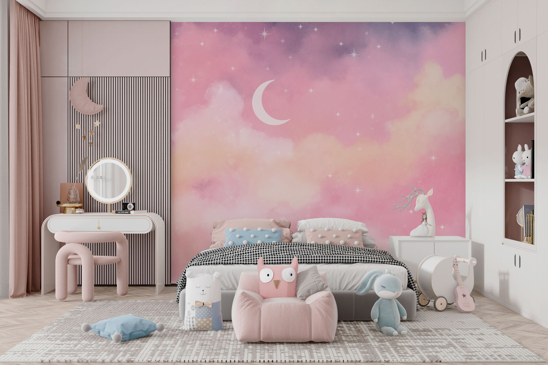 Proměňte dětský pokoj ve snovou noční oblohu pomocí této okouzlující nástěnné malby s jemnými růžovými odstíny, něžnými hvězdami a něžným půlměsícem. Představte si příběhy na dobrou noc, které se odehrávají pod hvězdným stropem, kde každý pohled vzbuzuje úžas. Obraz je ideální pro zažehnutí snů o dobrodružství a objevování, navozuje klidnou náladu a promění jakýkoli prostor v útulné útočiště. Je to jako přenést si kousek vesmíru do interiéru – ideální pro usínání nebo přitulení se k dobré knize. Jen si představte, jak se rozzáří ospalé oči, když uvidí tuto kouzelnou scénu!