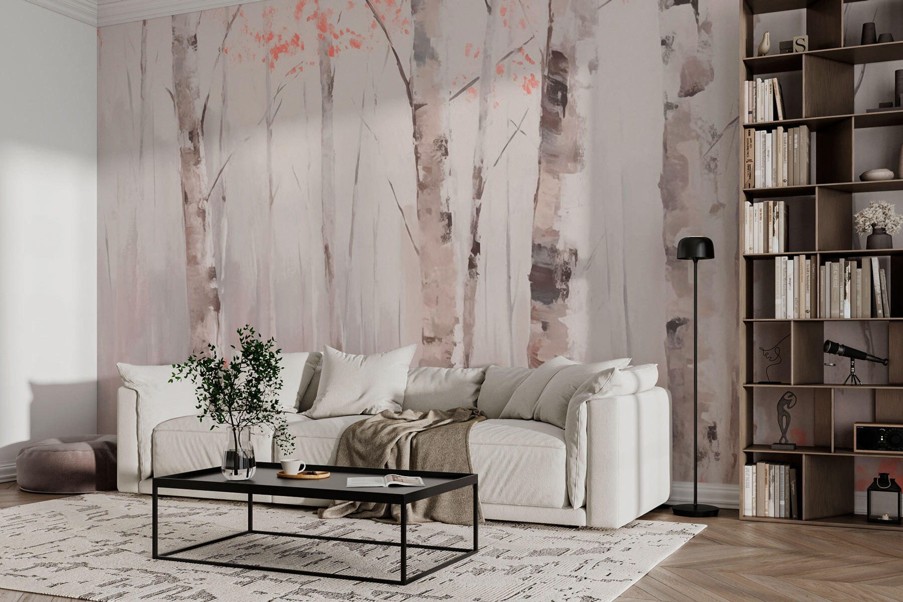 Proměňte svůj prostor pomocí této okouzlující nástěnné malby stromů oděných do jemných růžových listů. Představte si, že každý den vstupujete do klidného lesa, kde jemné pohupování bříz šeptá klid. Jemné odstíny vytvářejí vzdušnou atmosféru, která je ideální pro rozjasnění každé místnosti. Ať už se jedná o útulný kout nebo hlavní stěnu, tato nástěnná malba vás vybízí, abyste se ztratili v objetí přírody, i když doma jen popíjíte kávu. Navíc, kdo by neměl rád špetku barvy, která působí osvěžujícím a uklidňujícím dojmem? Je to jako přenést podzim do interiéru, ale bez chladu!