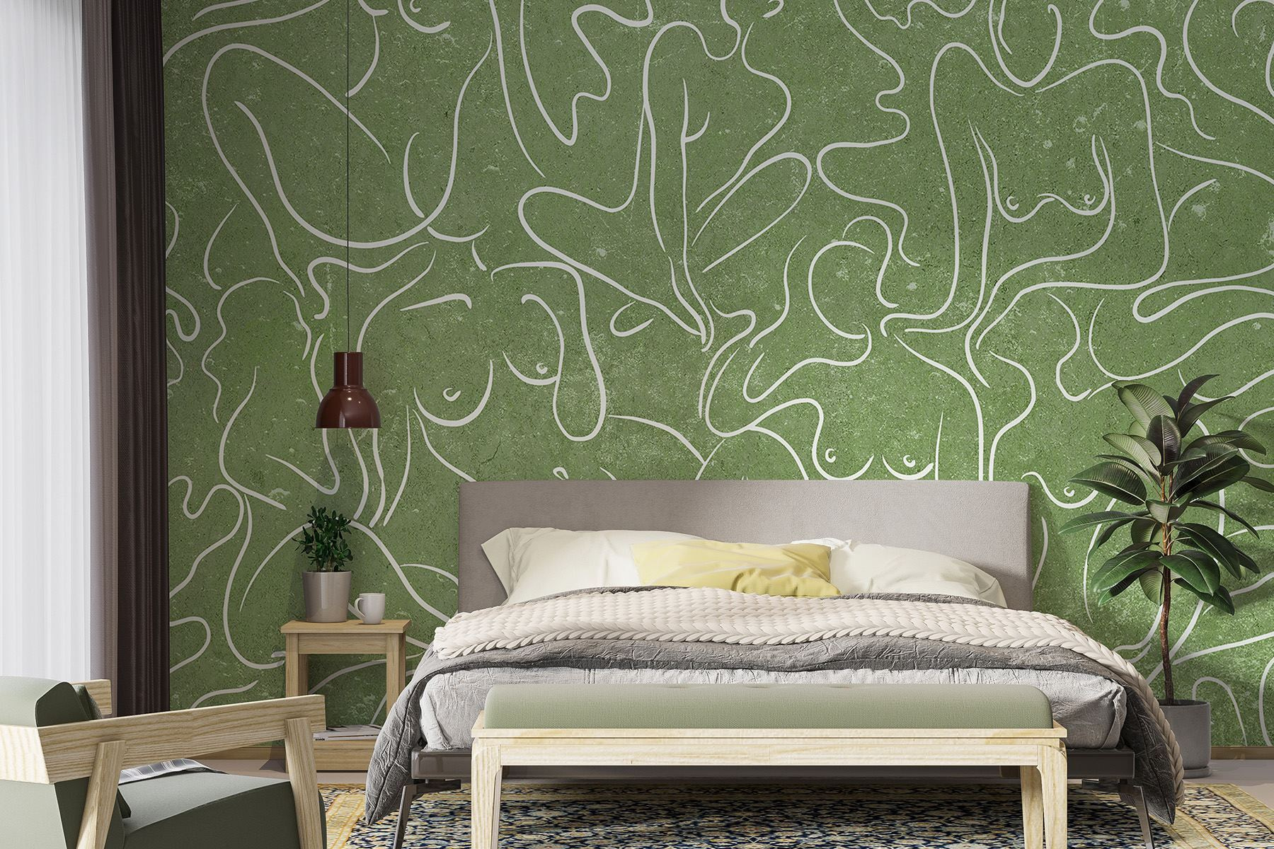 Představujeme vám nástěnnou malbu, která je jako hřejivé objetí pro jakýkoli prostor – představte si útulný kout proměněný ladnými obrysy žen, které se jemně vlní na měkkém zeleném pozadí. Tohle není jen dekorace, ale i zlepšovák nálady! Představte si, jak popíjíte čaj a jste ponořeni do myšlenek, zatímco tyto plynoucí postavy inspirují k tvořivosti a propojení. Přátelé si budou povídat o kráse a jednoduchosti toho všeho, zatímco vy si budete potají užívat komplimenty. Ideální do obývacího pokoje nebo klidné ložnice, vtáhne vás svým jemným šarmem a uměleckou atmosférou. Kdo by řekl, že nástěnné umění může působit tak lákavě?