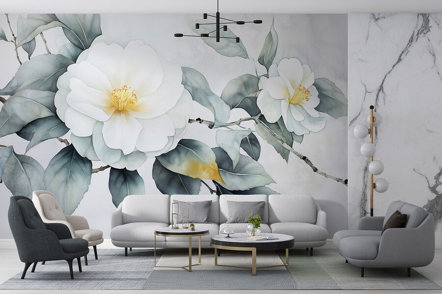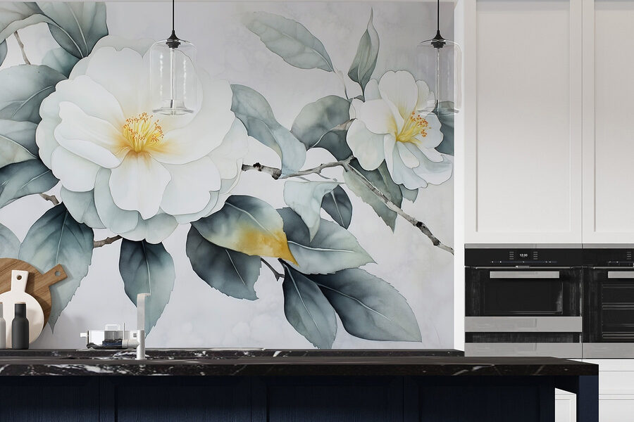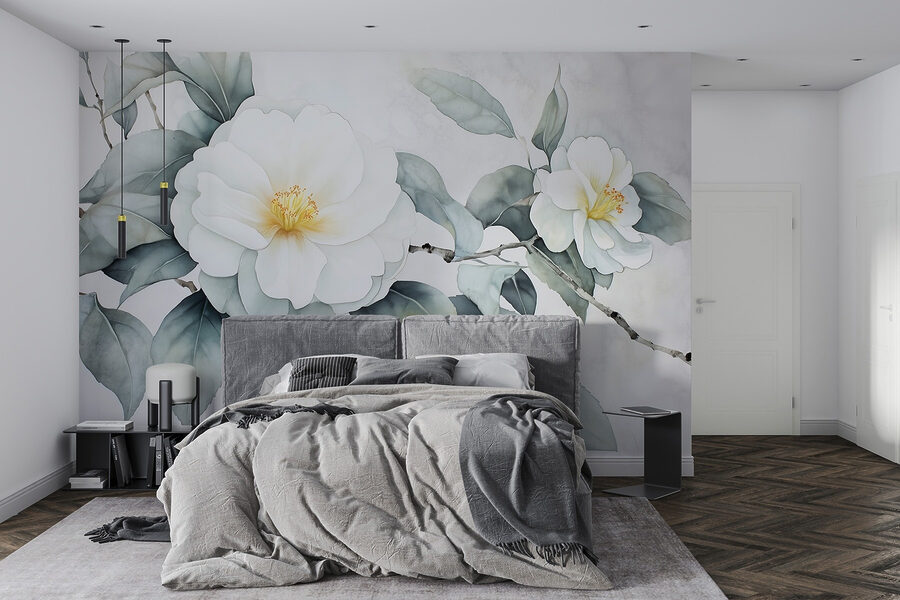 Proměňte nudnou stěnu v klidné útočiště s touto krásnou bílou květinovou fototapetou s jemnými zelenými listy. Je to jako vnést do interiéru závan čerstvého vzduchu, aniž byste museli cokoli zalévat. Tato nástěnná malba je ideální pro dny, kdy trocha zeleně dokáže zvednout náladu, a vytvoří uklidňující kulisu pro každou místnost. Představte si, že popíjíte ranní kávu a díváte se na tuto krásu – je to prakticky mini dovolená. Navíc je to skvělý začátek konverzace, zejména když se hosté ptají na vaši “tajnou zahradu”. Kdo potřebuje kompletní květinovou úpravu, když to zvládne tato nástěnná malba?
