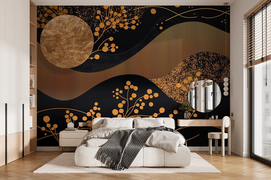 Proměňte jakýkoli prostor v útulné útočiště pomocí této úžasné nástěnné malby “Elegantní vzory na tmavém plátně”. Představte si, že stojíte ve svém pokoji, protože tato nástěnná malba zachycuje zajímavý tanec plynulých linií a okouzlujících shluků, které čekají jen na to, aby vyvolaly konverzaci. Syté barvy navozují klidnou, sofistikovanou atmosféru, která je ideální pro vytvoření relaxačního zákoutí, nebo dokonce temperamentního obývacího prostoru. Hosté se mohou přistihnout, že jsou přitahováni jeho vzory a přemýšlejí o jejich významu – nebo jen obdivují jeho krásu.