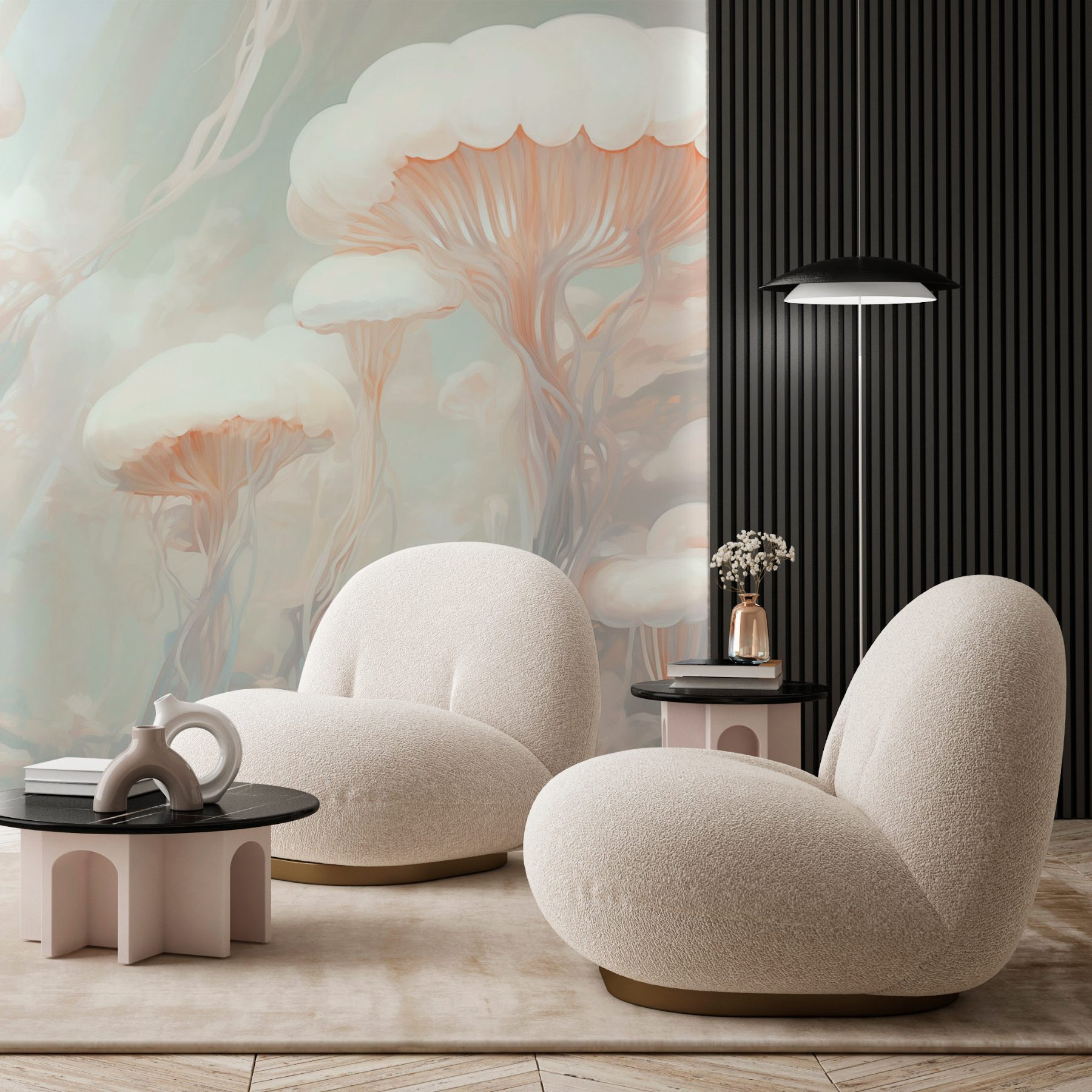 Proměňte místnost pomocí okouzlujícího půvabu nástěnné malby “Skupina bílých hub”. Představte si ji – zasněnou krajinu plnou rozmarných hub, které se ladně pohupují jako taneční zábava pro přírodu. Jemné barvy se mísí jako akvarelová malba a přinášejí klidnou atmosféru, která našeptává relaxaci. Tato nástěnná malba je ideální do útulného zákoutí nebo dokonce do svérázné kuchyně, a tak se v ní každý může cítit, jako by vstoupil do pohádky. Představte si, že zde popíjíte čaj, obklopeni tímto rozmarným kouzlem, a necháváte se unášet každodenními starostmi jako jemným vánkem. Je to víc než jen dekorace, je to zážitek, který čeká na své rozvinutí.