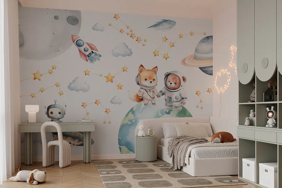 S touto nádhernou nástěnnou malbou s akvarelovými zvířaty ve vesmíru proměníte každou místnost v kosmickou říši divů. Představte si útulné zákoutí, kde liška a medvěd v oblecích kosmonautů společně zkoumají vesmír. Když se vznášejí mezi pastelovými planetami a třpytivými hvězdami, vypadá to, jako by vás zvali, abyste se připojili k jejich mezihvězdnému dobrodružství. Tato nástěnná malba je ideální pro děti nebo mladé duše a dodává jim rozmarný nádech, který podněcuje fantazii. Jen si představte tu radost, jak se pod tímto veselým vesmírem schoulíte s knížkou. Je to jemná připomínka toho, že zázrak je všude, dokonce i u vás doma. Váš prostor se může stát dalším velkým centrem pro objevitele galaxie – nebo jen útulným místem pro tulení a snění.