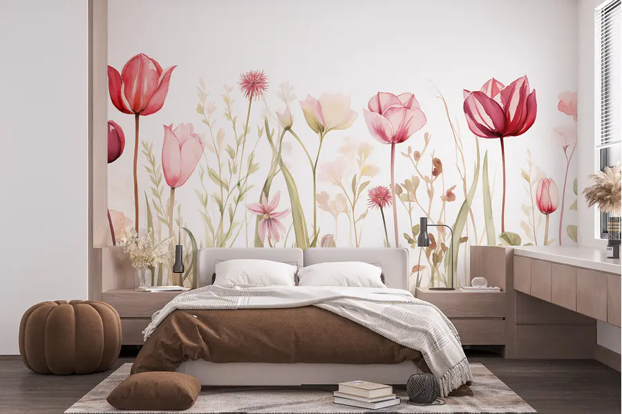 Proměňte jakýkoli prostor pomocí této úžasné nástěnné malby s nádhernou řadou květin a trávy. Představte si, že vejdete do místnosti a máte pocit, že jste vstoupili do klidné zahrady – kvetoucí okvětní lístky tančí ve větru. Každá květina jako by šeptala tajemství jara a vybízela k hřejivosti a veselí. Je ideální pro oživení nudných stěn nebo vytvoření útulného zákoutí. Hosté se možná skutečně zastaví se šálkem kávy v ruce, aby si to všechno prohlédli. Navíc může inspirovat k upřímným rozhovorům o oblíbených květinách. Je to víc než jen dekorace; je to živý šplouchnutí přírody, která jiskří radostí!