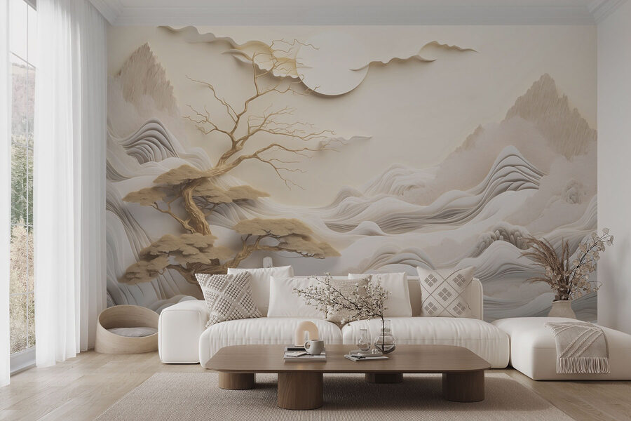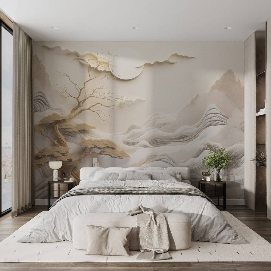 S touto úžasnou fototapetou se stromem, horami, mraky a velkým sluncem proměníte každou místnost v klidné útočiště. Je to jako přenést si klidný výhled na hory dovnitř, aniž byste se museli trmácet nahoru. Představte si, jak popíjíte kávu a přitom se necháváte pohltit jemnou září slunce, které vykukuje skrz hory. Skvěle se hodí do obývacího pokoje nebo útulného čtecího koutku, je to podnět ke konverzaci, který přiměje hosty přemýšlet o záhadách života. Navíc tlumené tóny vytvářejí klidnou atmosféru, takže je snadné relaxovat – kdo by nechtěl trochu objetí přírody? Upřímně řečeno, tato nástěnná malba je tou nejlepší kulisou pro líné neděle nebo spontánní taneční večírky.