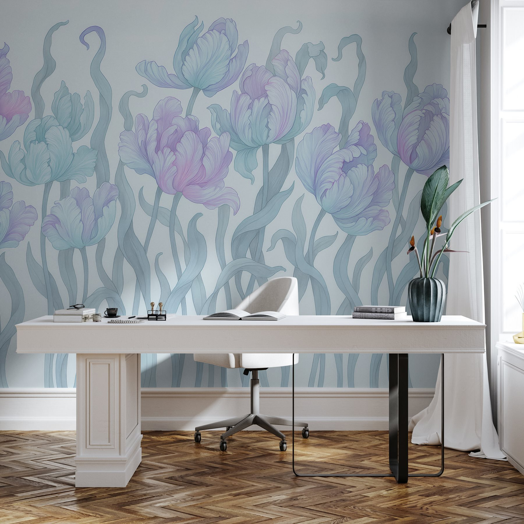 Proměňte svůj prostor pomocí této okouzlující nástěnné malby se zasněnou skupinou květin tančících uprostřed jemných vlajících listů. Představte si, že při každém vstupu do místnosti vstoupíte do zahrady – je to jako příroda přenesená do interiéru, ale bez špíny. Jemné barvy se krásně prolínají a působí uklidňujícím a povznášejícím dojmem. Ať už rozzáří útulný čtecí koutek, nebo udělá dojem v obývacím pokoji, je ideální pro ty, kteří chtějí nádech rozmarnosti. Navíc, kdo by nemiloval květiny, které nikdy neuvadnou? Nechte své stěny rozkvést osobností!