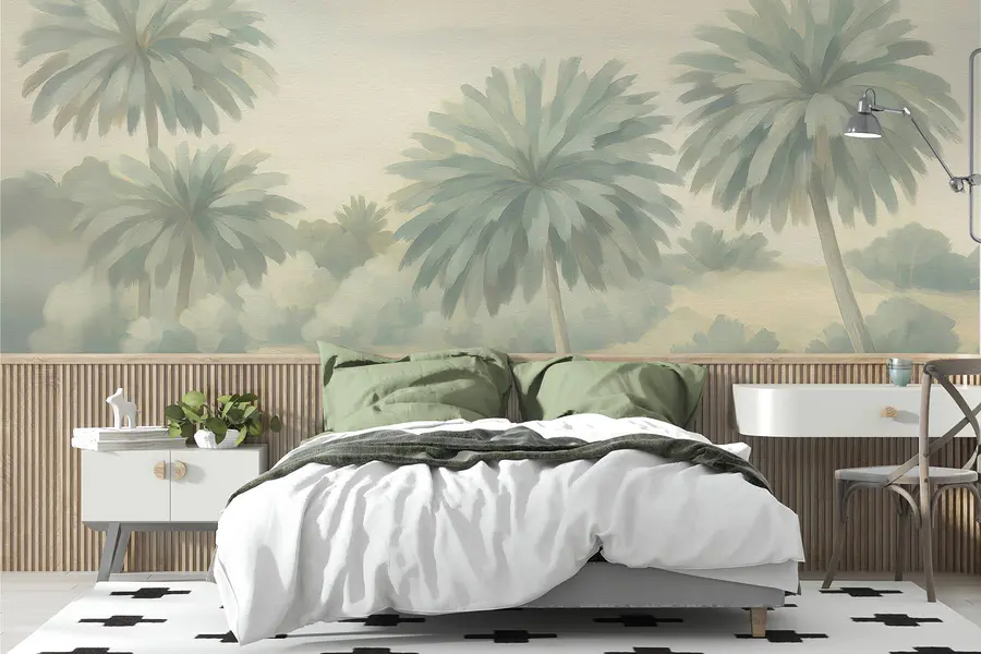 Proměňte každou místnost v tropickou oázu s touto úžasnou nástěnnou malbou palmy. Je to jako přenést kousek ráje do interiéru, aniž by hrozilo riziko spálení od slunce. Představte si to: popíjíte ranní kávu a přitom se díváte na tyto něžné obry pohupující se v jemném vánku. Tlumené tóny vytvářejí klidné pozadí, ideální pro relaxaci. Ideální do obývacích pokojů, ložnic nebo i útulných čtecích koutků, dodá dotek přírody bez údržby skutečných rostlin. Tato nástěnná malba vybízí ke snění o písečných plážích a teplém vánku. Kdo by to nemiloval?