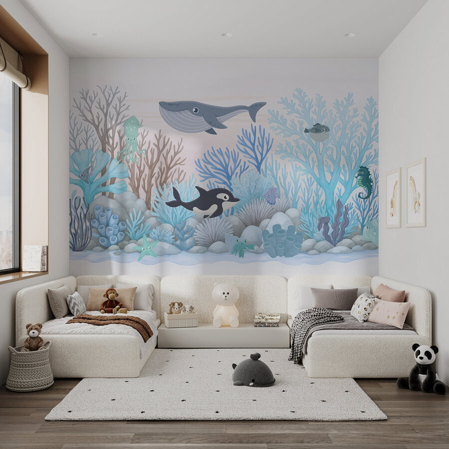S touto nástěnnou malbou s rozmarným podmořským dobrodružstvím se ponoříte do zábavy! Obrázek přátelských mořských tvorů skotačících mezi zářivými korály vytváří hravou atmosféru ideální pro dětské pokoje nebo hrací koutky. Jemná modř a měkké tvary vybízejí k pocitu klidu, takže se každý prostor bude cítit téměř jako tajný úkryt v oceánu. Představte si, jak malé děti ukazují na kosatku nebo se chichotají nad hloupoučkou chobotnicí – každý pohled vyvolá úsměv. Tato nástěnná malba není jen dekorací, je to brána do světa plného fantazie. Proměňte prázdné stěny v živou mořskou krajinu, ve které budou mít všichni pocit, že právě objevili poklad pod vlnami!