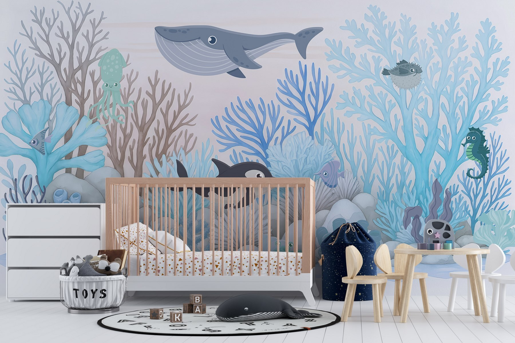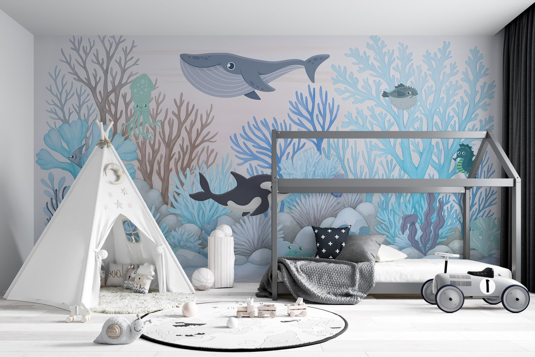 S touto nástěnnou malbou s rozmarným podmořským dobrodružstvím se ponoříte do zábavy! Obrázek přátelských mořských tvorů skotačících mezi zářivými korály vytváří hravou atmosféru ideální pro dětské pokoje nebo hrací koutky. Jemná modř a měkké tvary vybízejí k pocitu klidu, takže se každý prostor bude cítit téměř jako tajný úkryt v oceánu. Představte si, jak malé děti ukazují na kosatku nebo se chichotají nad hloupoučkou chobotnicí – každý pohled vyvolá úsměv. Tato nástěnná malba není jen dekorací, je to brána do světa plného fantazie. Proměňte prázdné stěny v živou mořskou krajinu, ve které budou mít všichni pocit, že právě objevili poklad pod vlnami!