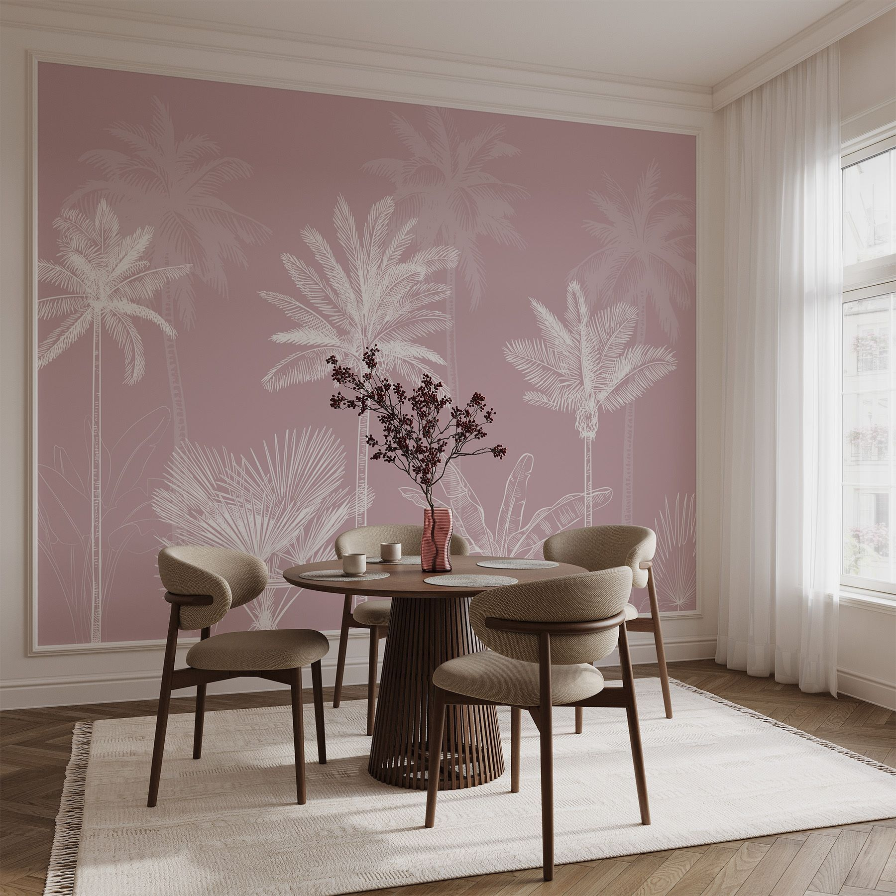 Proměňte každou místnost pomocí této okouzlující nástěnné malby “Skupina palem”. Představte si, že pokaždé, když vstoupíte do svého prostoru, vstoupíte do klidného tropického prostředí. Jemné, tlumené růžové pozadí vybízí k útulné atmosféře, takže je dokonalým pozadím pro relaxační večer po dlouhém dni. Je to, jako by váš byt najednou provoněl oceánský vánek – bez písku v botách. Ty složitě nakreslené palmy dodávají eleganci, ale neberou se příliš vážně. Od obývacího pokoje až po domácí kancelář, je to hravé přitakání přírodě, díky kterému stěny ožijí. Ideální pro snění!