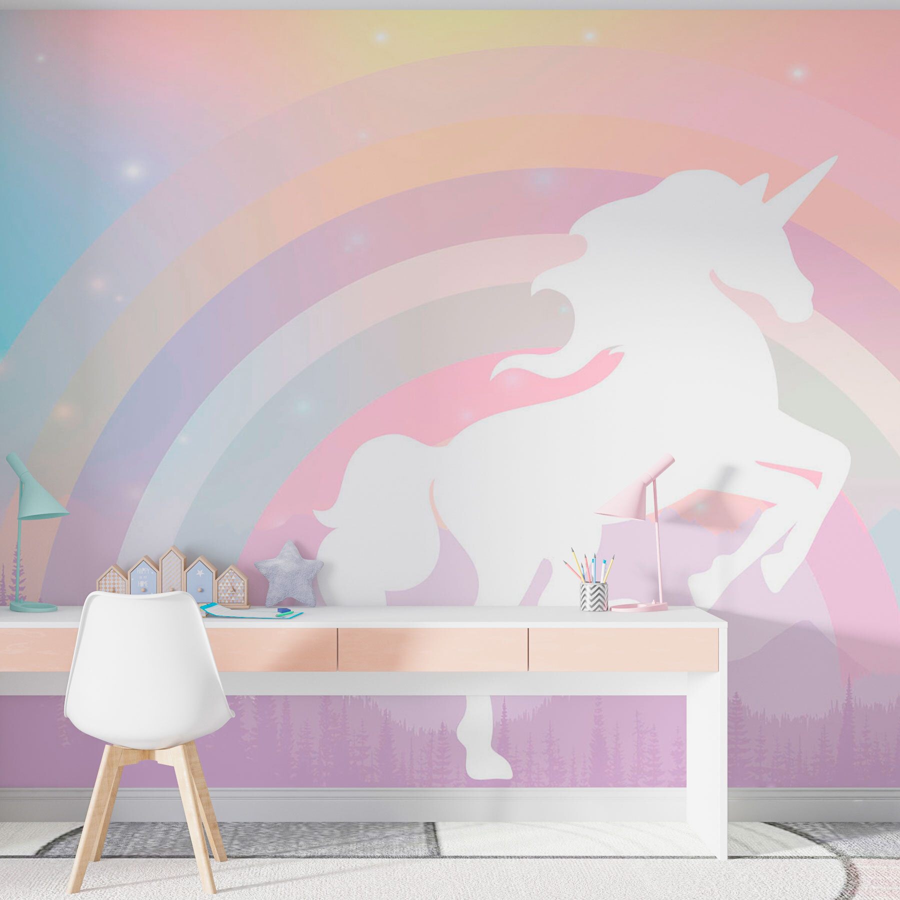S touto okouzlující nástěnnou malbou jednorožce proměníte jakýkoli prostor v rozmarnou říši divů! Představte si to: jemné pastelové barvy se prolínají do snové duhy, zatímco v pozadí tiše přihlížejí majestátní hory. Tato nástěnná malba je jako hřejivé objetí pro vaše stěny, které do vašeho každodenního života vnese kapku magie. Představte si úsměvy, které vykouzlí na tvářích dětí i dospělých a vyvolá snění o dobrodružstvích a bájných říších. Skvěle se hodí do dětských pokojů, heren nebo jakéhokoli koutu, který by potřeboval kapku radosti. Je to hravý únik, díky němuž se domov bude cítit o něco výjimečněji. Kdo by nechtěl, aby nad jeho pohovkou skotačil jednorožec?
