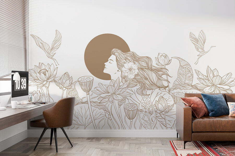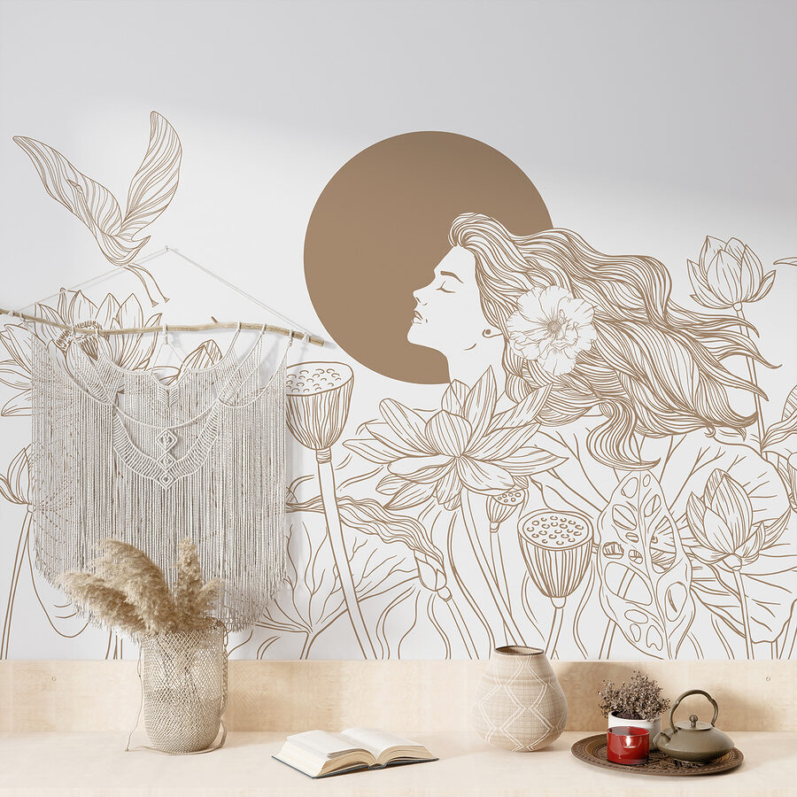 Proměňte jakýkoli prostor v klidné útočiště pomocí této úžasné nástěnné malby s ženou obklopenou jemnými květinami. Představte si to: po dlouhém dni vejdete do svého pokoje a přivítají vás uklidňující květy a klidná atmosféra – jako mini svatyně přímo u vás doma. Jemné splývání jejích vlasů a měkké linie vytvářejí přívětivou atmosféru. Je ideální pro útulné zákoutí nebo jako výrazný kousek, který vyvolá konverzaci. Představte si, jak při pohledu na tento zasněný výjev popíjíte čaj a cítíte, jak se stres rozplývá. Jednoduché, a přesto okouzlující! Vaše stěny vám poděkují.