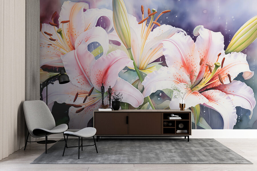 Rozjasněte každou místnost nástěnnou malbou Lilie v květu: Lilie v květech: design Krása přírody. Tato úžasná nástěnná malba vyniká živými liliemi v jemných růžových a bílých barvách a promění váš prostor v oázu klidu. Představte si, že vejdete do místnosti, kde na stěnách tančí květinové sny. Je to jako přenést kousek přírody do interiéru, bez potřeby zalévání. Tato nástěnná malba, která se skvěle hodí do útulných zákoutí nebo jako výrazný prvek, zachycuje osvěžující pocit jara – každý den máte pocit, že se probouzíte v zahradě. Přátelé ji budou jistě obdivovat, a kdo ví, možná vzbudí vážnou závist vůči rostlinám!