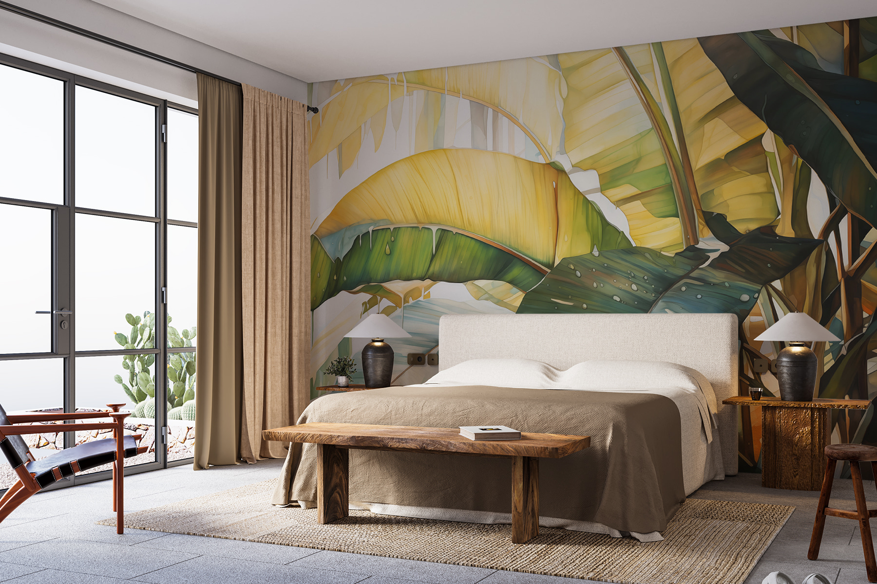 Detaily jsou neuvěřitelné – každý list vypadá, jako by se téměř pohupoval v jemném vánku. A způsob, jakým se barvy prolínají? Prostě snové. Je to jako mít doma svůj vlastní kousek tropů, aniž byste museli letět letadlem. Ať už přemýšlíte o oživení obývacího pokoje, odvážném prohlášení v ložnici nebo vytvoření klidné atmosféry v pracovním prostoru, tato nástěnná malba vám kryje záda. Navíc je tu něco na té dřevěné struktuře, která dodává útulný, rustikální šarm.