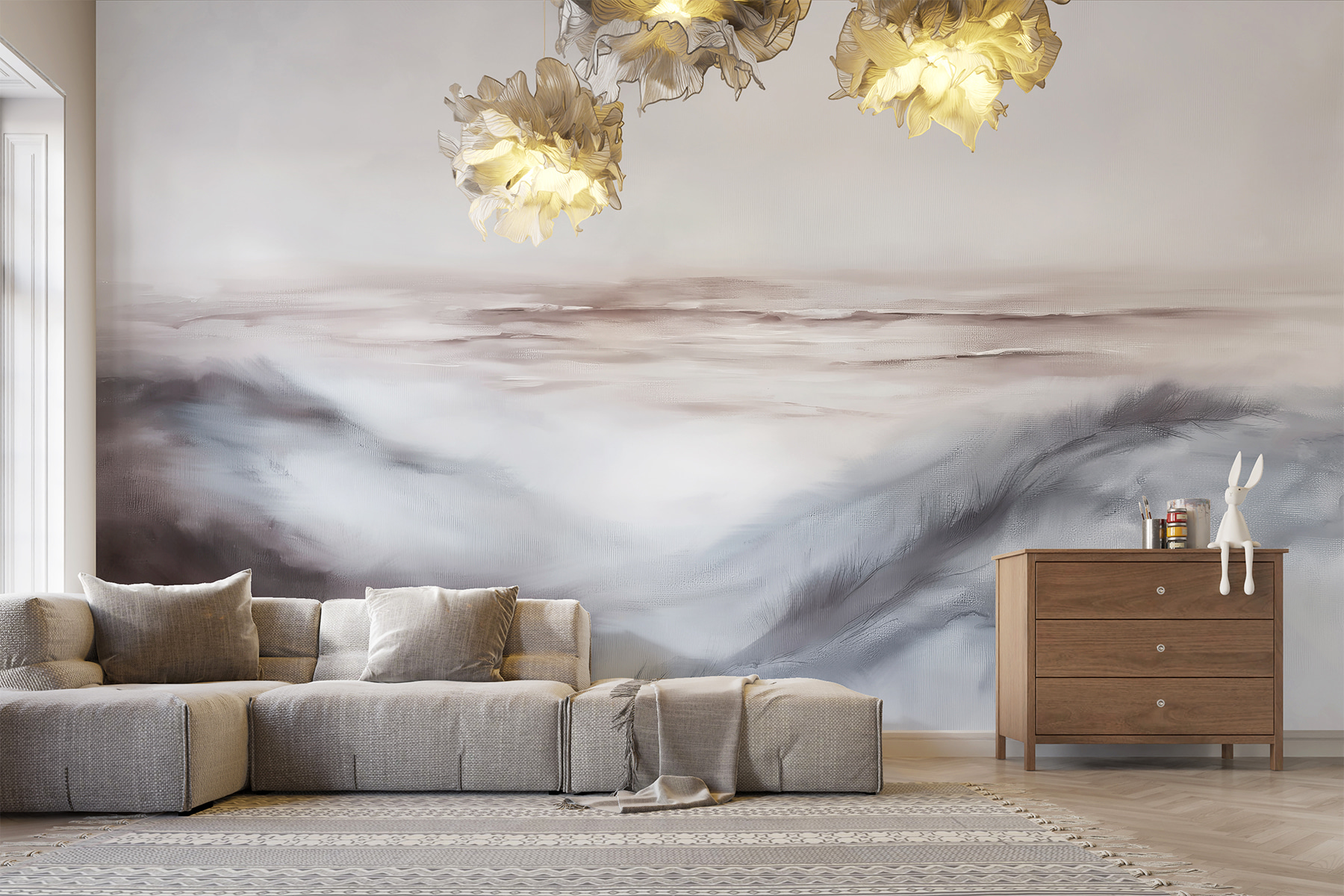 Proměňte jakýkoli prostor pomocí této úchvatné nástěnné malby krajiny. Je to jako mít klidný únik přímo na zdi. Představte si to: každý den se probouzíte do jemných odstínů měkké šedé a uklidňující bílé, které vytvářejí útulnou atmosféru, jež našeptává klid. Snová kvalita této nástěnné malby vybízí ke snění a relaxačním okamžikům – ideální pro popíjení kávy nebo schoulení se do klubíčka s dobrou knihou. Ať už se nachází v obývacím pokoji nebo v tichém zákoutí, toto umělecké dílo dodá nádech blaženého klidu. Není to jen dekorace, je to každodenní připomínka zastavení a dýchání, díky níž se domov cítí ještě výjimečněji.