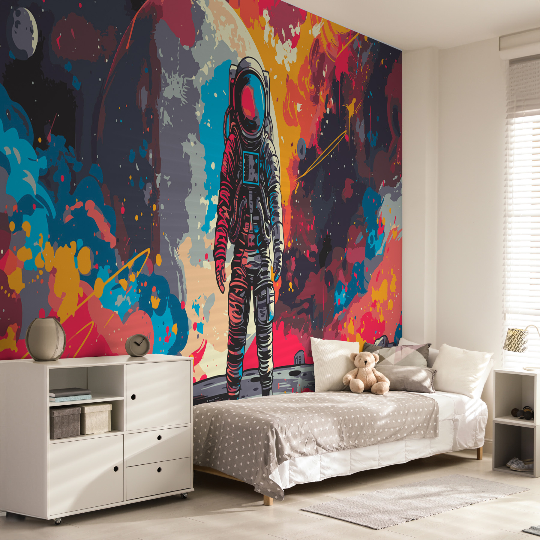 Představte si astronauta přímo z vašich nejdivočejších vesmírných snů, jak stojí na pozadí exploze mezihvězdné scenérie. Je to jako vesmírná taneční párty pokaždé, když se na ni podíváte! Ideální pro každého, kdo chce do svého pokoje vnést prvek zázraku a neomezených možností. Děti, dospělí – každý se jistě ztratí v jeho okouzlujících galaktických vibracích. Je to ten typ nástěnné malby, která vás donutí přemýšlet, snít a možná i plánovat cestu ke hvězdám!