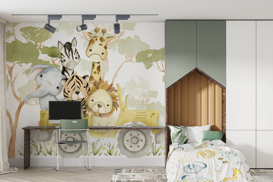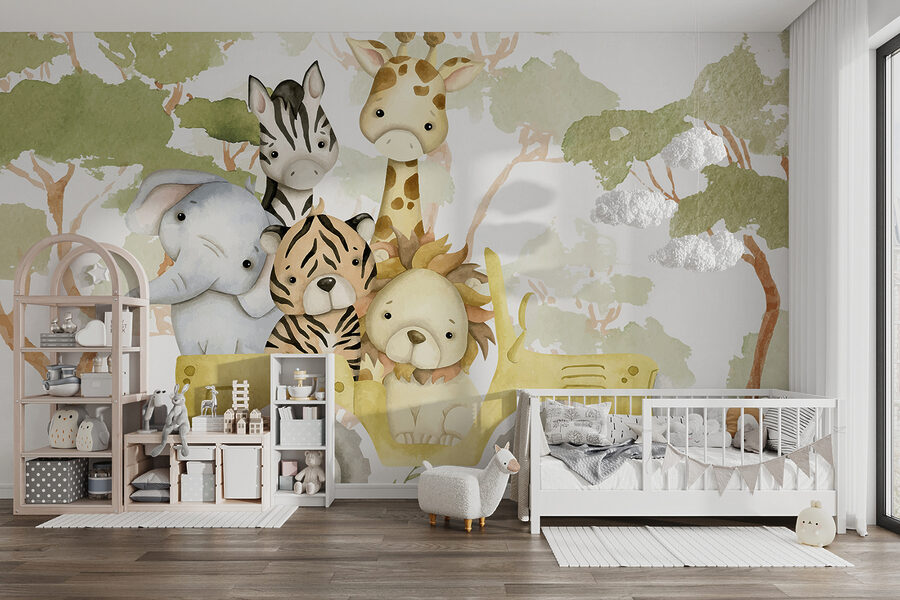 Podívejte se na tento rozkošný potisk “Fototapeta w08233”! Je to jako rozmarné safari, které ožívá přímo na vaší zdi. Ideální pro každého, kdo si potrpí na hravou a zábavnou atmosféru – zejména pokud jste milovníci zvířat! Představte si tuto svéráznou partu dobrodruhů – slona, zebru, tygra, lva a žirafu, díky nimž se každý den budete cítit jako na mini výpravě do džungle.