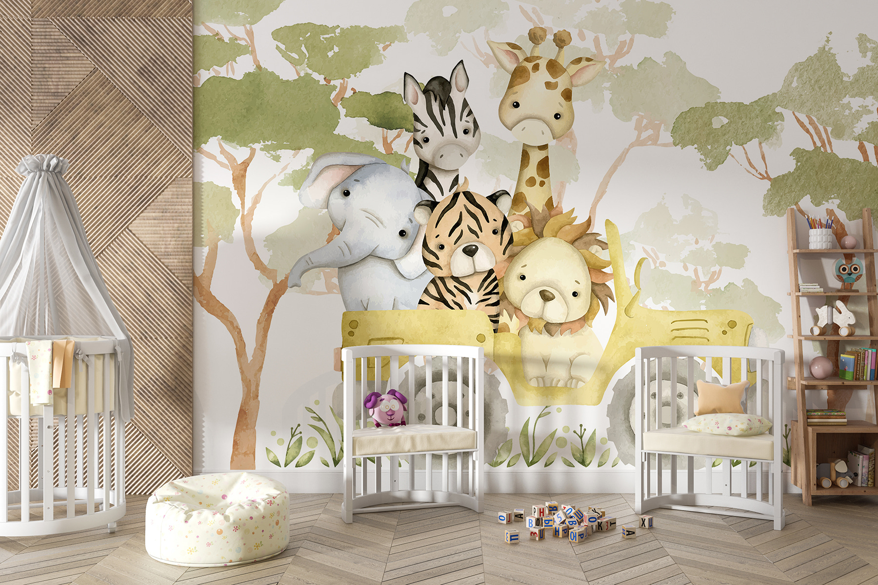 Představte si to: vejdete do místnosti a tato roztomilá stvoření vás přivítají svými zvědavými výrazy. Jako by vás zvali, abyste se připojili k jejich malé eskapádě! Akvarelový styl působí jemně a uklidňujícím dojmem – je to téměř jako scéna z pohádkové knihy, která se odehrává přímo u vás doma. Ať už tedy proměňujete dětský pokoj nebo jen chcete do svého života vnést trochu rozmarnosti, tato nástěnná malba vás dostane.
