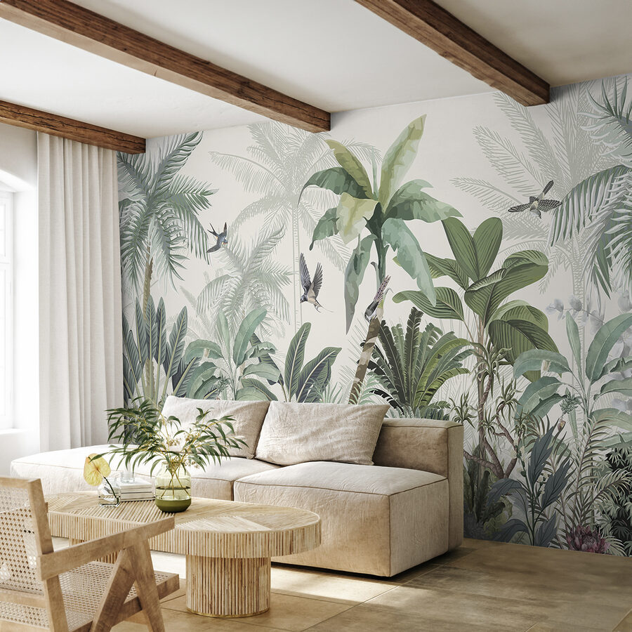 S touto úžasnou nástěnnou malbou proměníte jakýkoli prostor v tropickou oázu. Je to jako mít doma kousek džungle se svěží zelení a veselými ptáky. Představte si, že usrkáváte ranní kávu a vítá vás jemná tropická atmosféra – vážně, může být lepší způsob, jak začít den? Tato tapeta nejenže změní místnost, ale pozve přírodu dovnitř, kde bude šeptat o bezstarostných odpoledních a sluncem zalitých dobrodružstvích. Skvěle se hodí do obývacího pokoje nebo i do útulného čtecího koutku, je to malý únik přímo na vaše stěny. Každý pohled je jako mini dovolená, a to přímo z pohodlí domova.