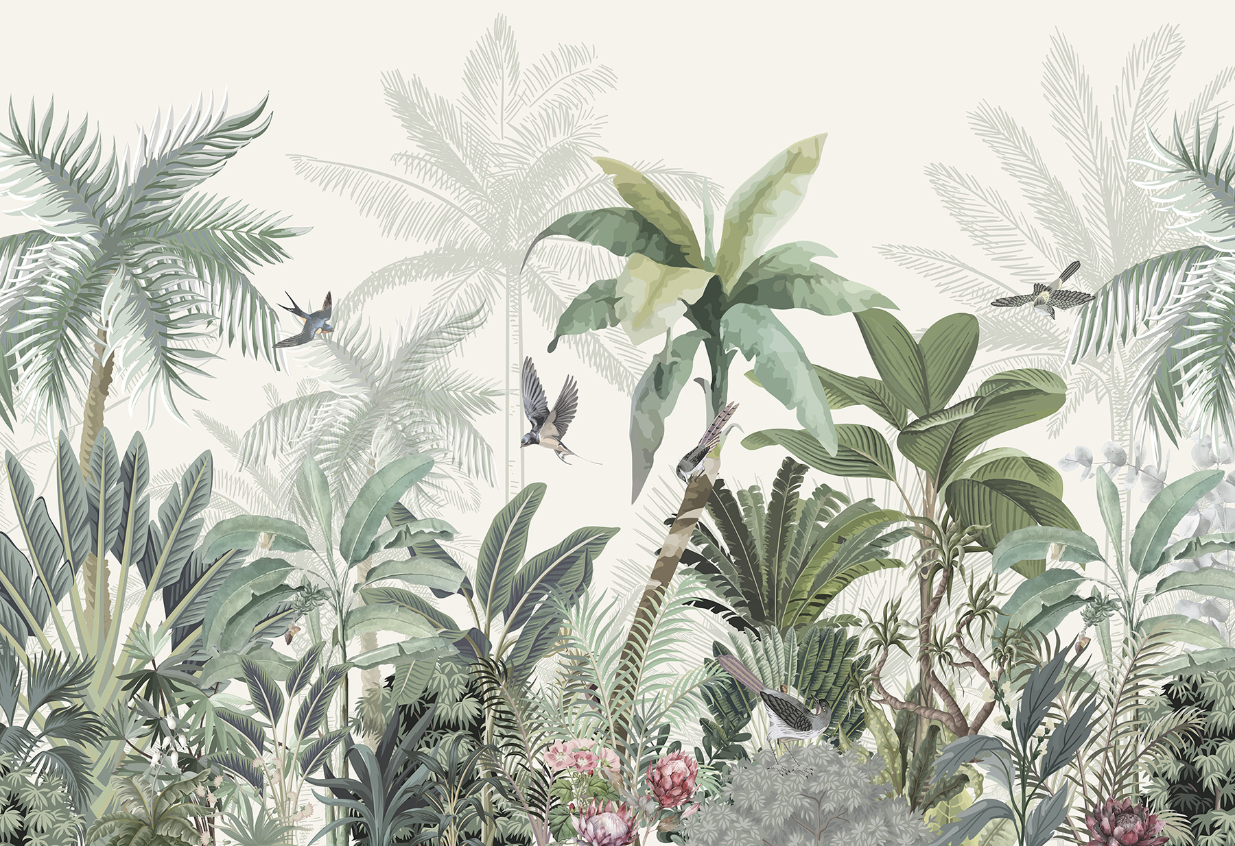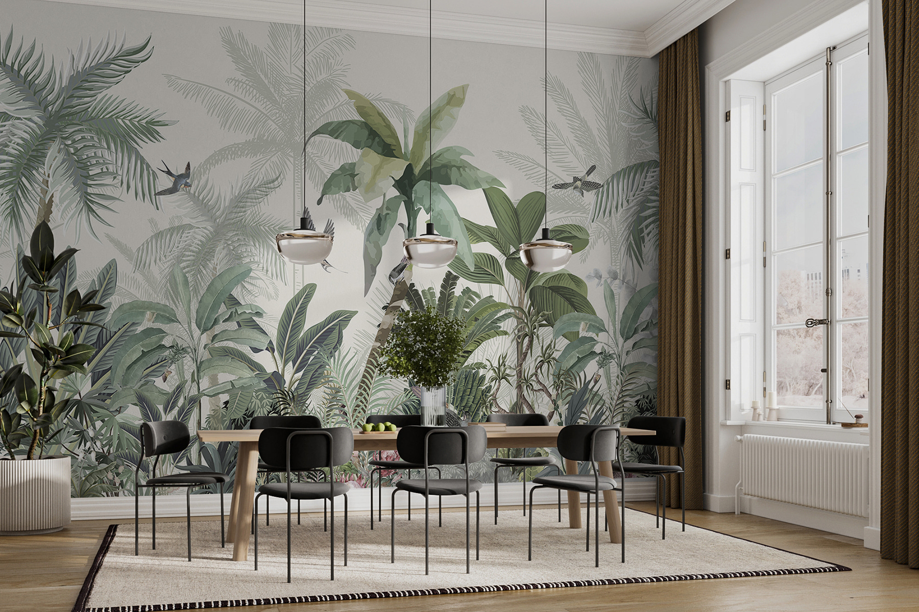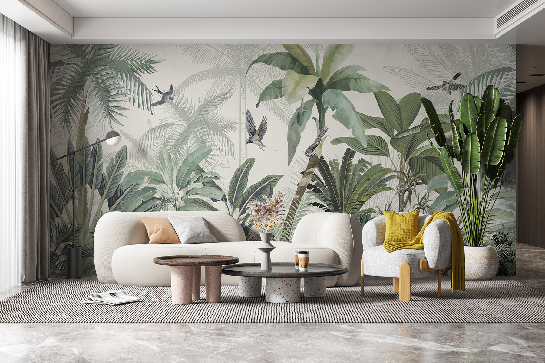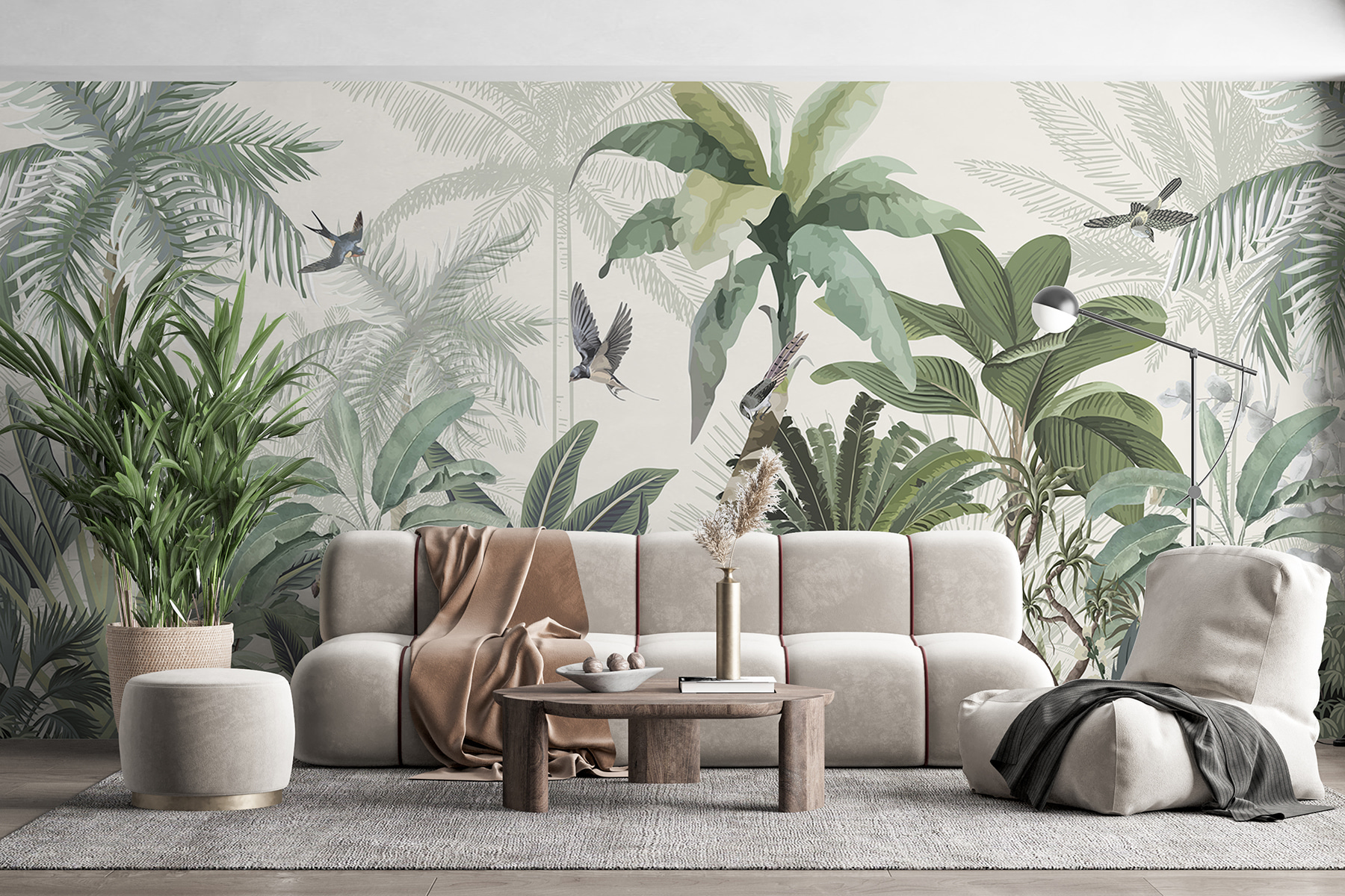 S touto úžasnou nástěnnou malbou proměníte jakýkoli prostor v tropickou oázu. Je to jako mít doma kousek džungle se svěží zelení a veselými ptáky. Představte si, že usrkáváte ranní kávu a vítá vás jemná tropická atmosféra – vážně, může být lepší způsob, jak začít den? Tato tapeta nejenže změní místnost, ale pozve přírodu dovnitř, kde bude šeptat o bezstarostných odpoledních a sluncem zalitých dobrodružstvích. Skvěle se hodí do obývacího pokoje nebo i do útulného čtecího koutku, je to malý únik přímo na vaše stěny. Každý pohled je jako mini dovolená, a to přímo z pohodlí domova.