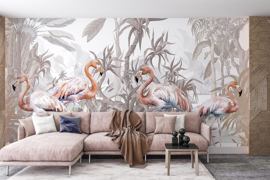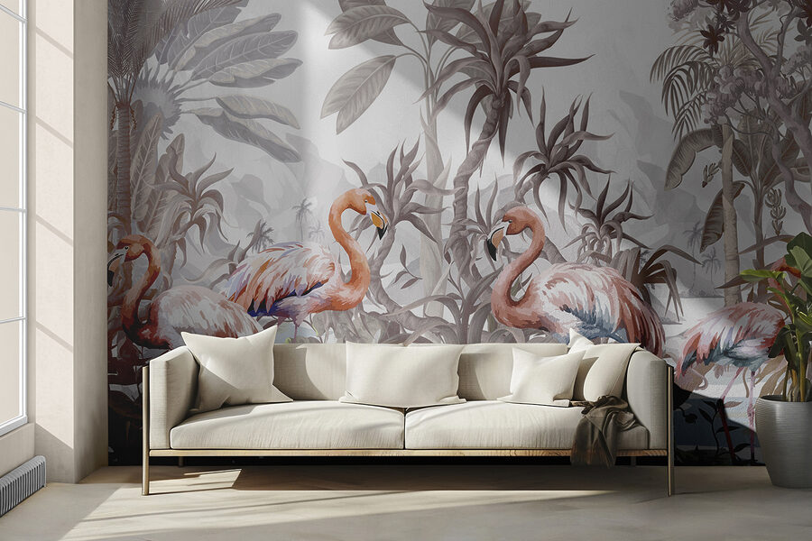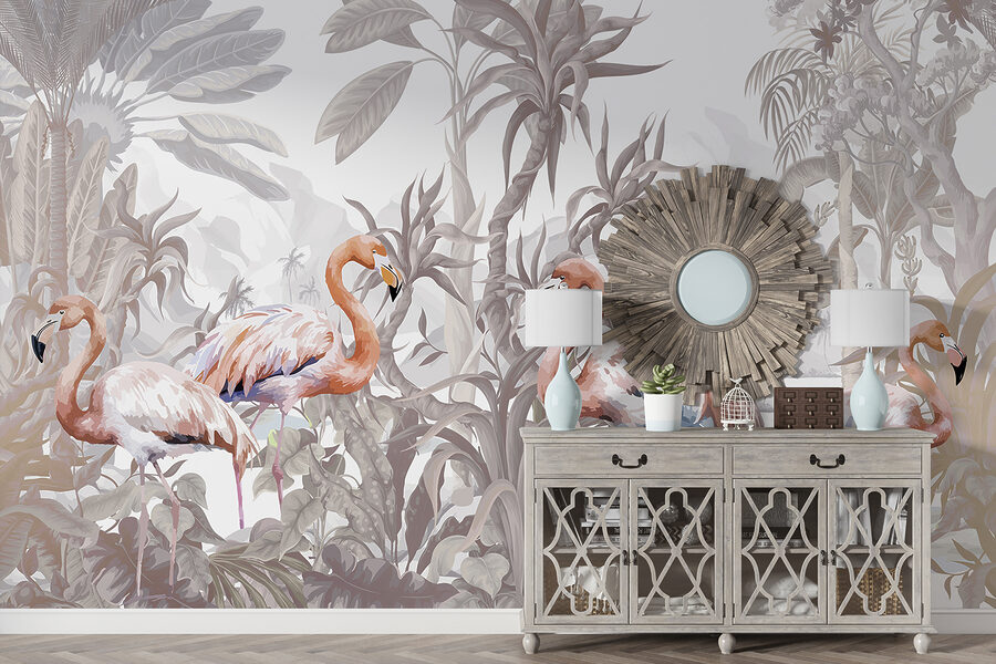 Vstupte do rozmarného světa s touto nástěnnou malbou plameňáka. Představte si, jak popíjíte ranní kávu a tito elegantní ptáci usazení uprostřed svěží tropické zeleně rozjasňují váš prostor. Jemné odstíny vytvářejí klidnou atmosféru, téměř jako byste byli každý den na mini dovolené. Ideální pro doplnění vašeho obývacího pokoje nebo ložnice o kousek přírody. Je to jako mít skrytý kousek ráje přímo na stěně. Kdo by řekl, že plameňáci mohou být vašimi novými nejlepšími dekorativními přáteli? Opeřená sofistikovanost se snoubí s uvolněným šarmem.