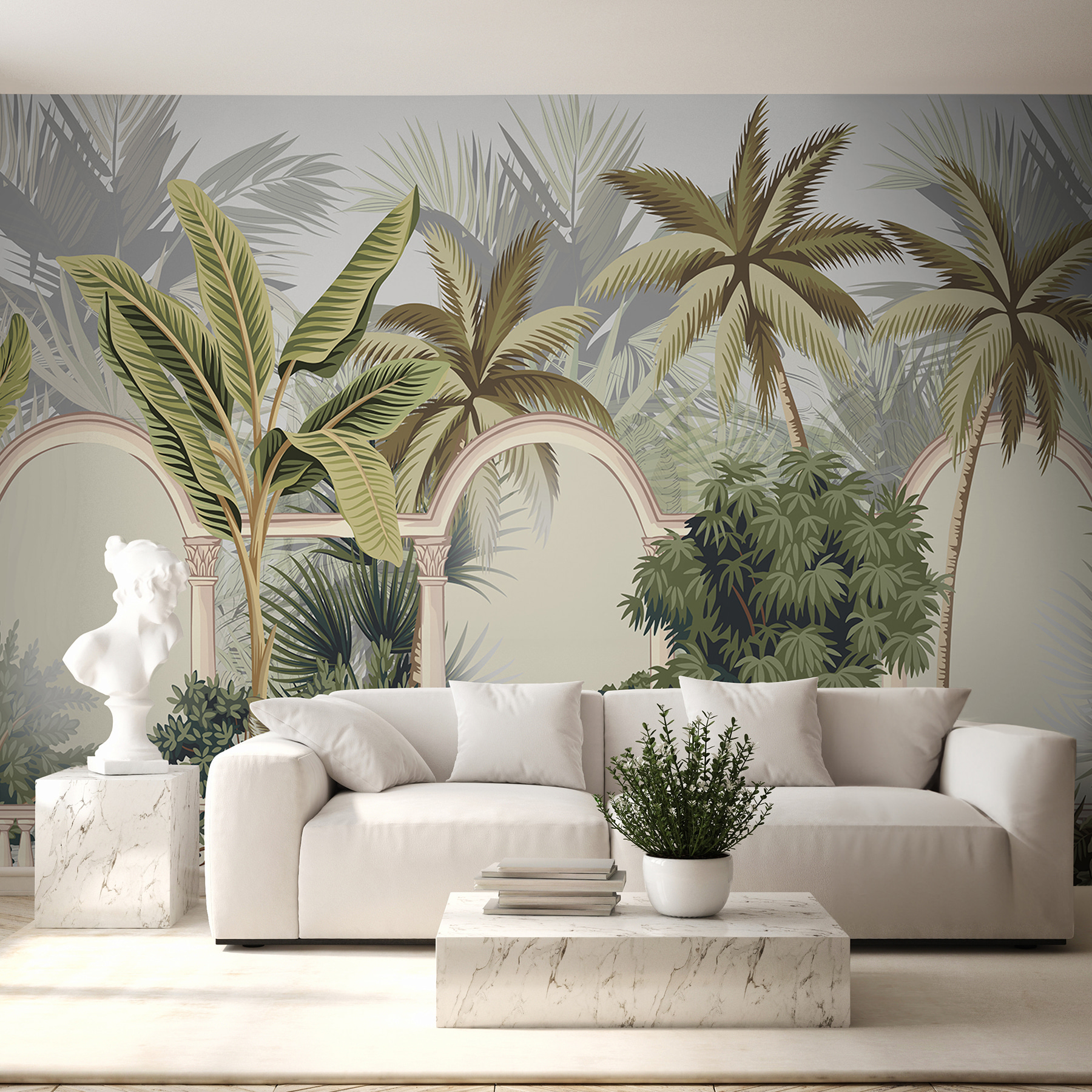 Představte si, že vejdete do svého pokoje a máte pocit, že jste vstoupili do klidné tropické oázy. Tato nástěnná malba s půvabnými palmami, které se jemně pohupují na pozadí elegantních oblouků, tuto atmosféru bez problémů vytvoří. Je to jako váš vlastní malý únik – okno do svěží džungle, aniž byste museli opustit domov. Ideální pro dodání nádechu přírody a špetky dobrodružství do vašeho prostoru. Kdo by řekl, že stěna může být vaší vstupenkou do ráje? Přidejte pohodlné sezení a možná se vám podaří ztratit se ve snění o ostrovním vánku.
