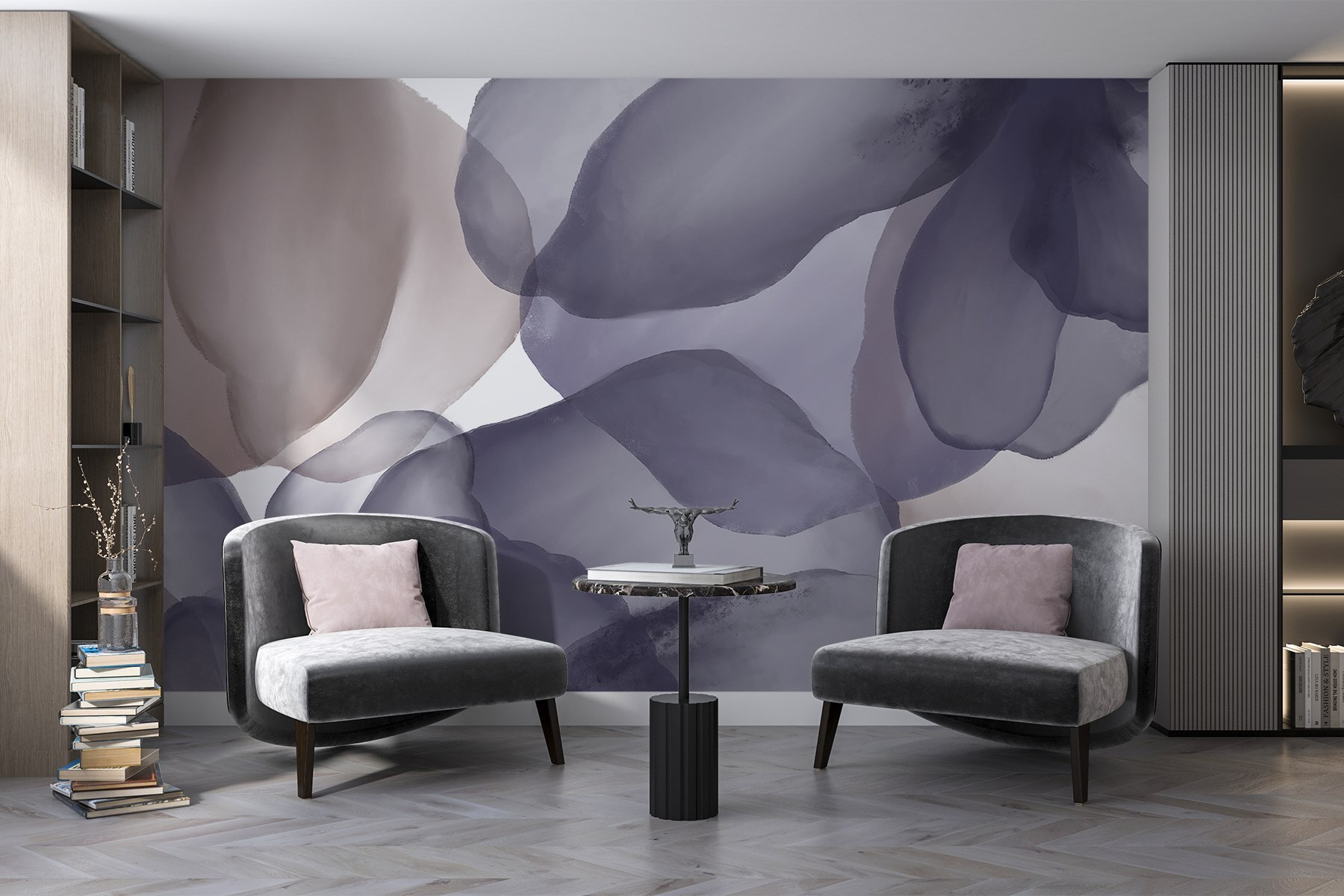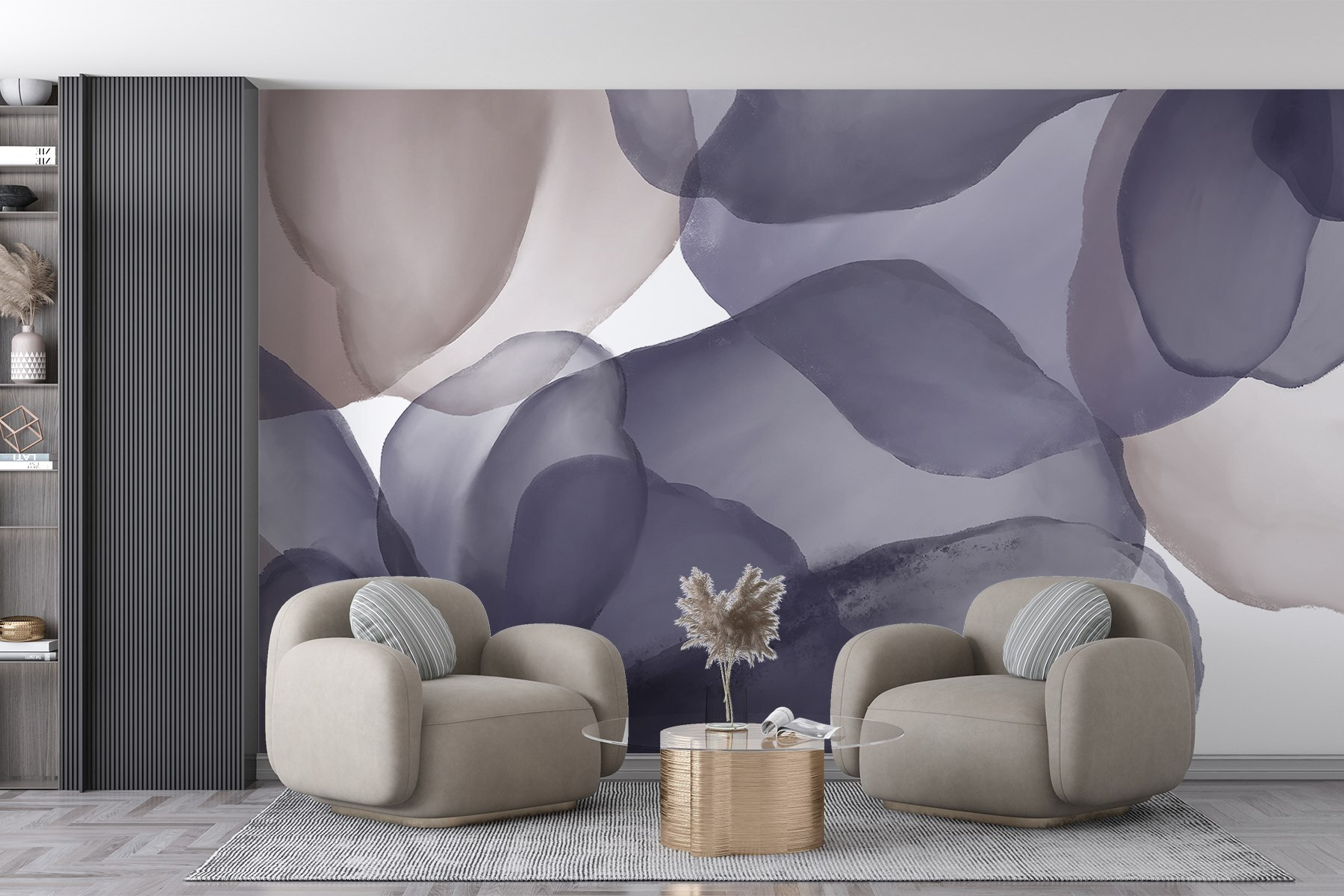 Proměňte svůj prostor s nástěnnými malbami “Nástěnné malby Jemné odstíny se mísí v půvabných vlnách”. Jemné barvy této nástěnné malby spolu tančí jako akvarelové snění a vytvářejí klidnou atmosféru, která našeptává relaxaci. Představte si, že vejdete do místnosti, která působí jako hřejivé objetí. Díky těmto jemným levandulovým a šedým tónům mohou být i ta nejrušnější rána o něco klidnější a vybízet ke klidnému šálku kávy nebo chvíli tichého rozjímání. Navíc si prakticky říká o nějaký útulný nábytek, ke kterému se můžete přitulit. Ideální pro milovníky přírody nebo kohokoli, kdo potřebuje ve svém životě trochu uměleckého vkusu – tato nástěnná malba je jako přátelské uvítání pokaždé, když vstoupíte do místnosti. Kdo by to nechtěl?