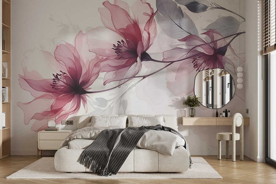 Proměňte svůj prostor pomocí “Jemných květů v jemných odstínech”. Představte si, že vstoupíte do klidné japonské zahrady, kde pivoňky jemně tančí ve vánku – tato nástěnná malba přenese tento klid přímo na vaši zeď. Jemná růžová a decentní zelená vytvářejí atmosféru, která působí svěže a zároveň klidně.