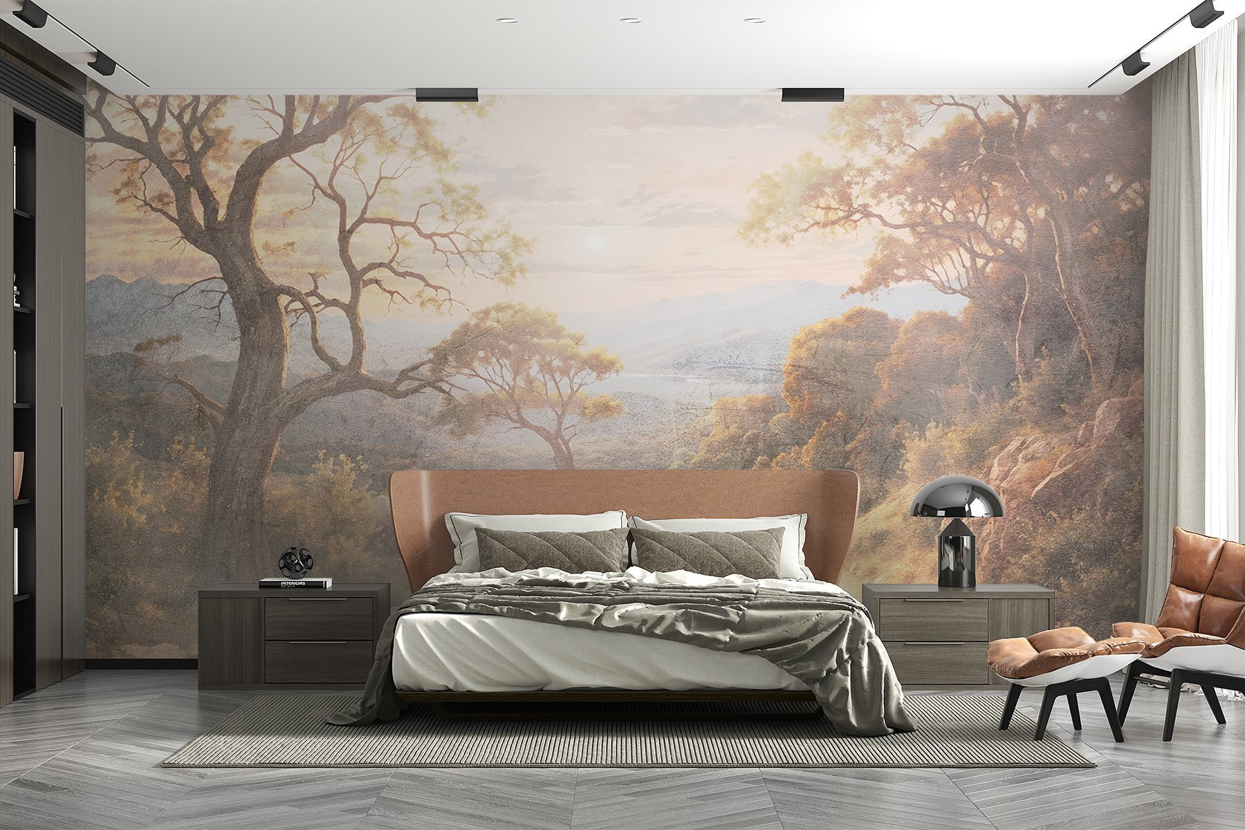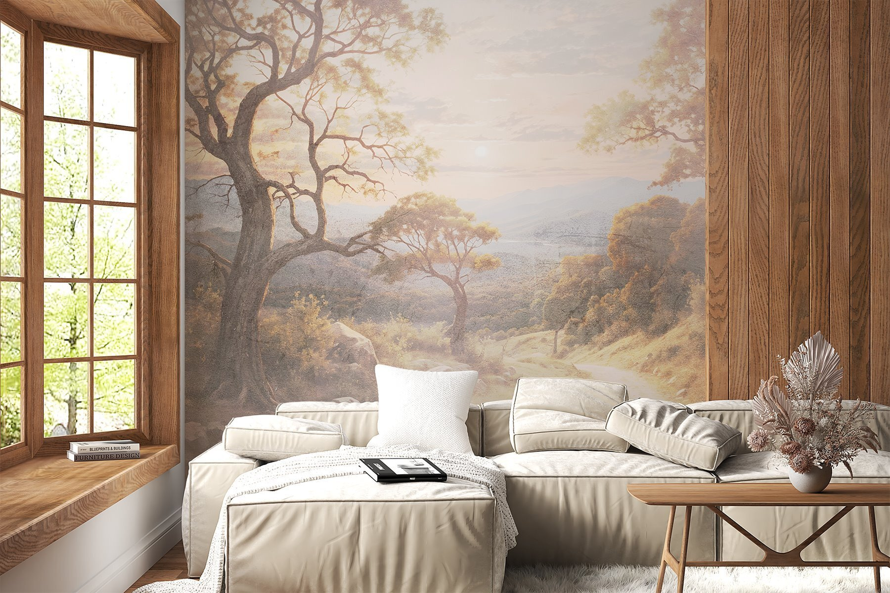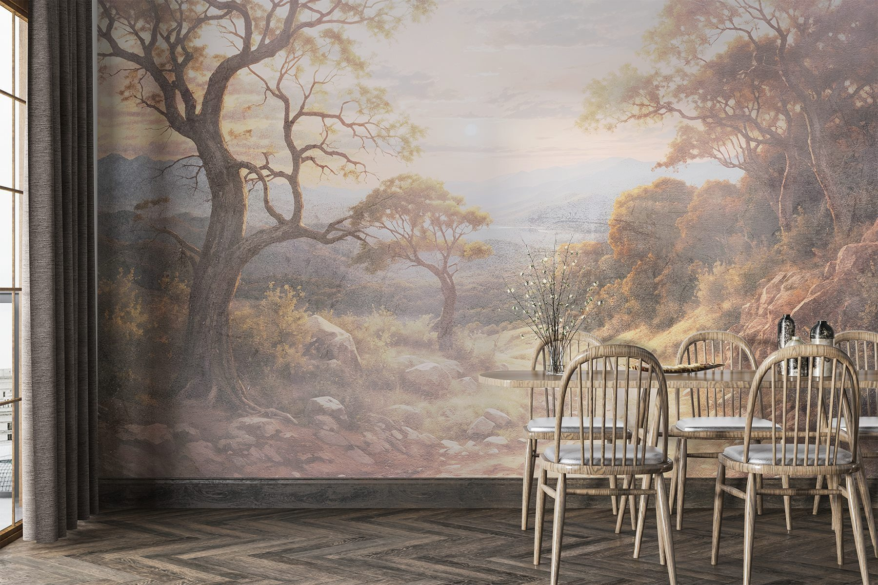 S touto okouzlující nástěnnou malbou s klikatou polní cestou lemovanou majestátními stromy a vzdálenými horami proměníte každou místnost v klidné útočiště. Představte si, že pokaždé, když vstoupíte do svého prostoru, vstoupíte do klidného útočiště. Měkké barvy a jemné textury vás vtáhnou dovnitř, jako by vás vybízely k procházce po této zasněné cestě. Ideální do obývacích pokojů nebo čtecích koutků, šeptá klid a přináší krásu přírody do interiéru. Jen si to představte – přátelé se vás možná začnou ptát, jestli jste se nepřestěhovali na venkov! Osvěžte své stěny a nechte se unášet relaxačními vibracemi; tato nástěnná malba má kouzlo přírody, o které se můžete podělit.