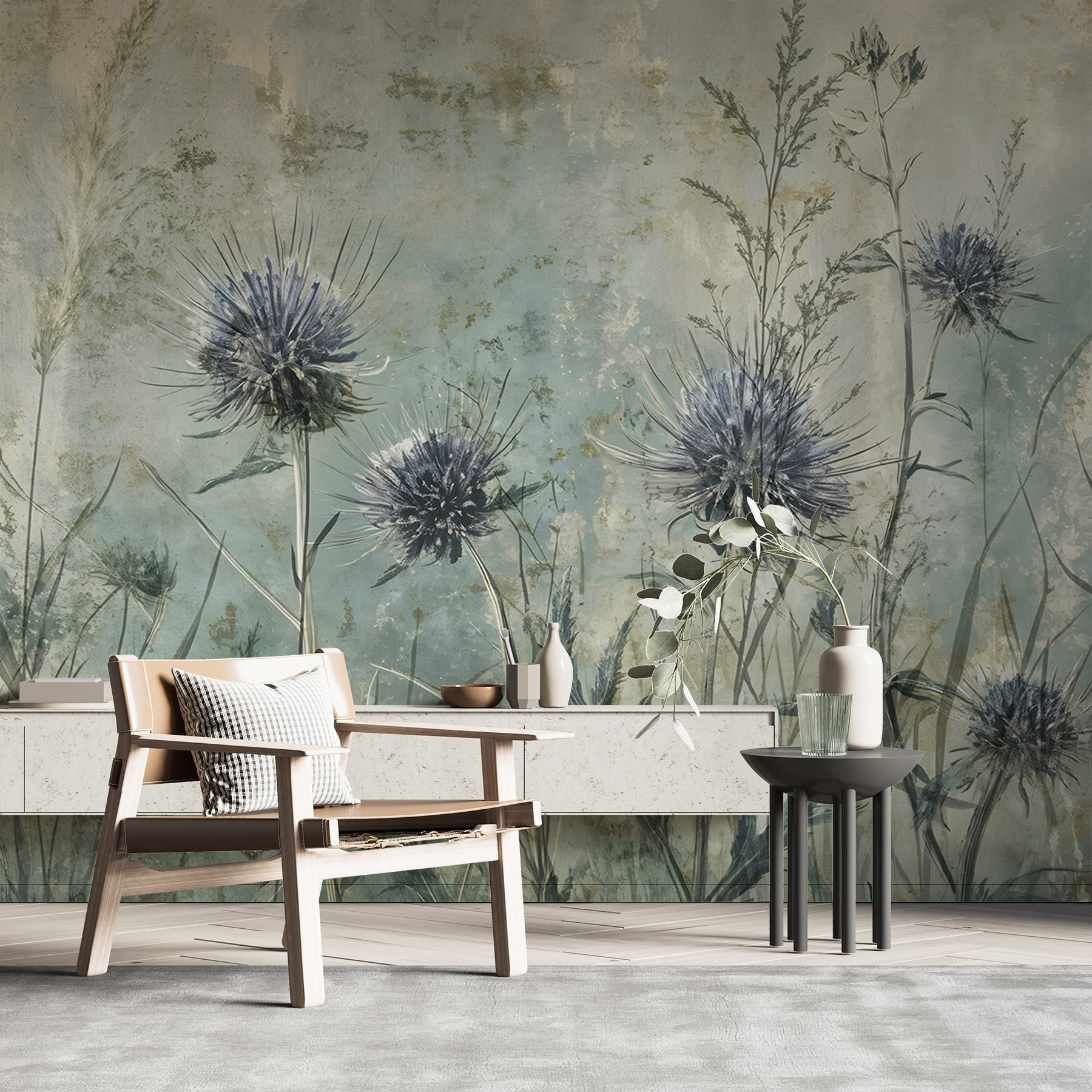 Proměňte jakýkoli prostor v klidné útočiště pomocí této okouzlující nástěnné malby s květinami a rostlinami. Představte si, že se probouzíte do jemné modři a zeleně, kde se pohupují vysoké trávy a živé květy vybízejí k úsměvu. Ideální pro ty, kteří milují přírodu, je to jako mít klidnou zahradu přímo v obývacím pokoji. Přátelé se možná zatoulají dovnitř, zastaví se a řeknou: “Páni, kde jsi to vzal?”. Vyvolává rozhovory a přitahuje lidi. Jemné barvy přinášejí pocit klidu, takže je ideální pro útulné večery nebo klidná rána. Kdo by nechtěl přijít domů do malého kousku přírody?