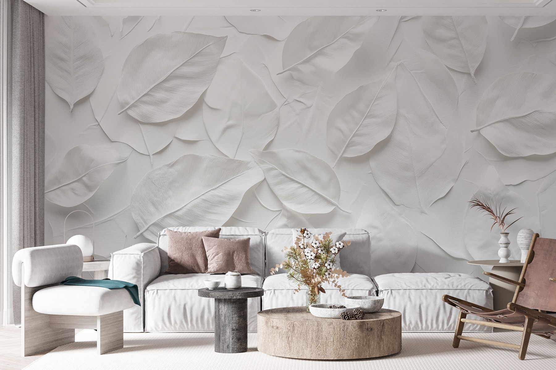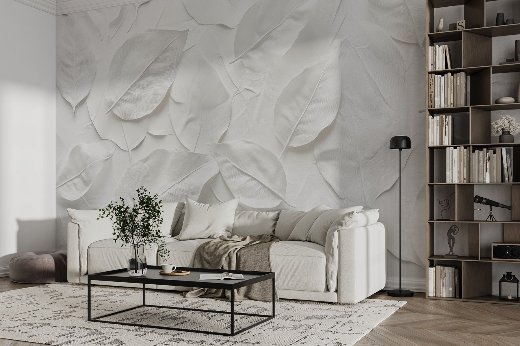 Proměňte svůj prostor pomocí této úžasné nástěnné malby s krásným uspořádáním bílých listů. Je to jako vnést do interiéru dotek přírody bez starostí se zaléváním rostlin. Představte si, že popíjíte ranní kávu na tomto klidném pozadí, kde se jednoduchost snoubí s elegancí. Tento design dodává svěží atmosféru, ideální pro ty, kteří touží po klidném útočišti přímo u sebe doma. Ať už se jedná o útulný obývací pokoj nebo klidnou ložnici, tato nástěnná malba prostě našeptává: “Relaxujte.” Kdo by se nechtěl každý den cítit trochu víc zenově? Je nenápadná, a přesto pozoruhodně okouzlující – stejně jako příroda sama.