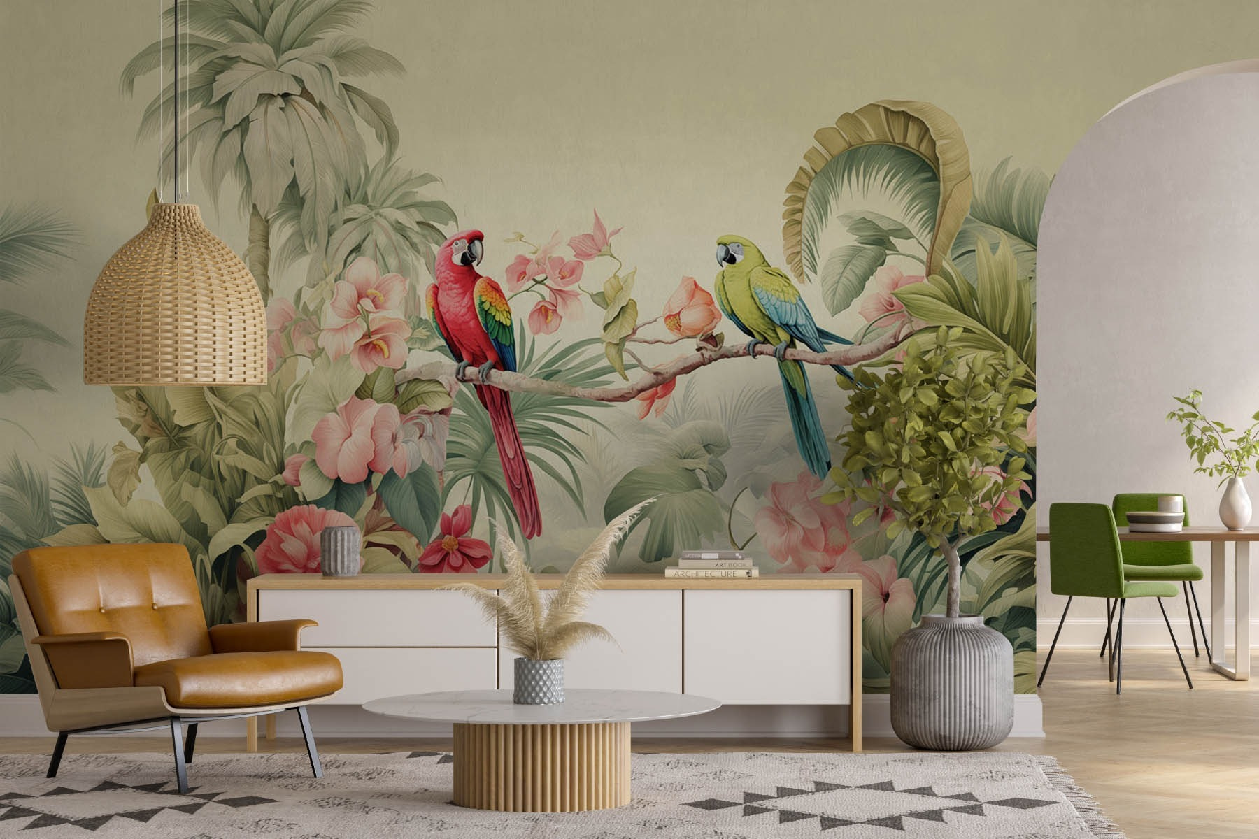 Proměňte svůj prostor pomocí této živé nástěnné malby s půvabným párem papoušků ladně sedících na větvi. Tito opeření přátelé vnesou nádech tropického ráje přímo do vašeho domova. Svěží květy a listy vytvářejí klidnou atmosféru, takže se skvěle hodí do útulného čtecího koutku nebo živého obývacího pokoje. Představte si, že popíjíte ranní kávu obklopeni touto záplavou barev – je to jako být na věčné dovolené! Navíc hravé vibrace papoušků mohou inspirovat i k drzým rozhovorům. Přijměte krásu přírody a nechte své stěny vyprávět příběh!