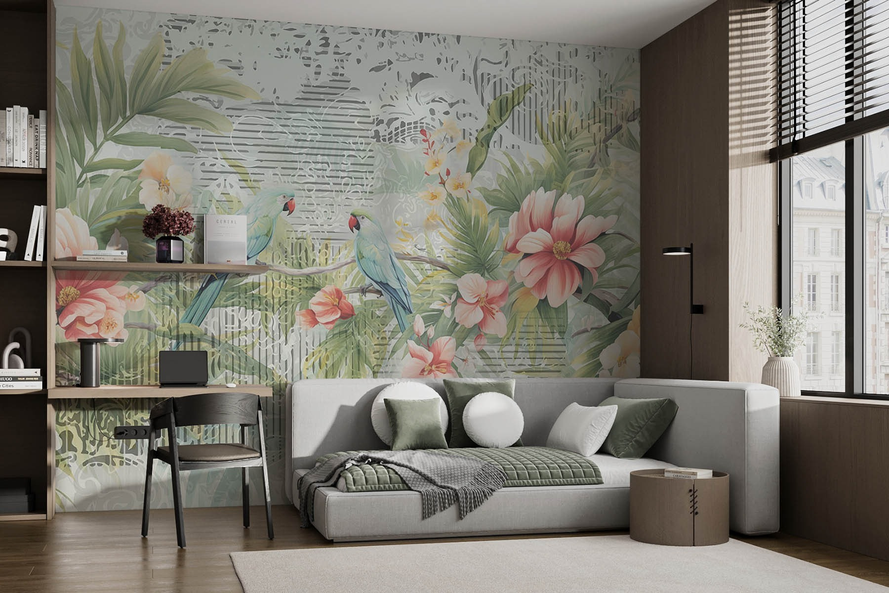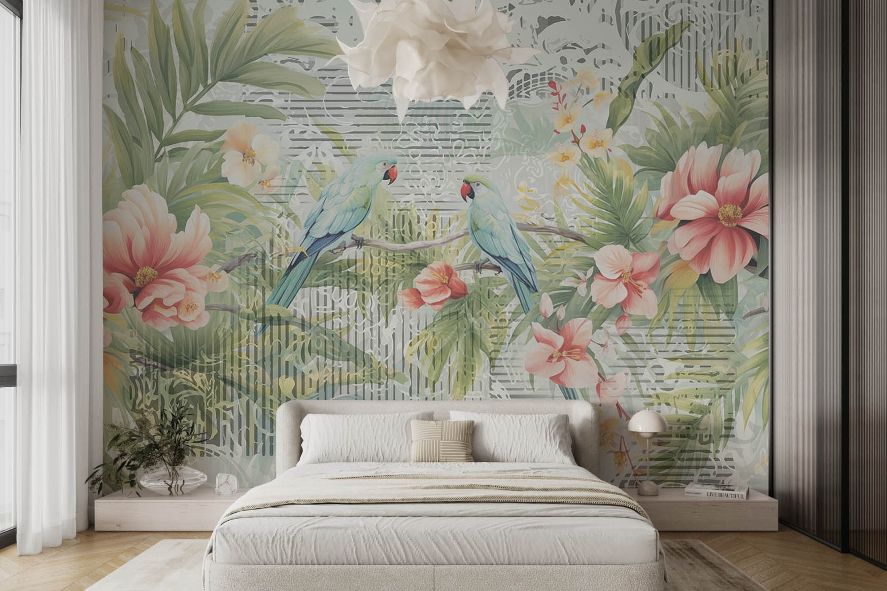 Vneste do interiéru kouzlo přírody s touto úžasnou nástěnnou malbou s ptáky sedícími na větvi obklopenými živými květinami. Je to jako mít kousek tropů přímo na zdi! Představte si, že se každé ráno probouzíte s tímto barevným výjevem – modrá a růžová barva jistě rozzáří každou místnost. Ať už se nachází v obývacím pokoji, útulném zákoutí, nebo dokonce v domácí kanceláři, tato nástěnná malba našeptává: “Odpočívejte a užívejte si krásy přírody.” Není to jen dekorace, ale i zlepšovač nálady. Kdo by se nechtěl cítit jako na věčné dovolené? Tak do toho, přidejte tento veselý nádech a sledujte, jak se váš prostor promění v tropickou oázu!