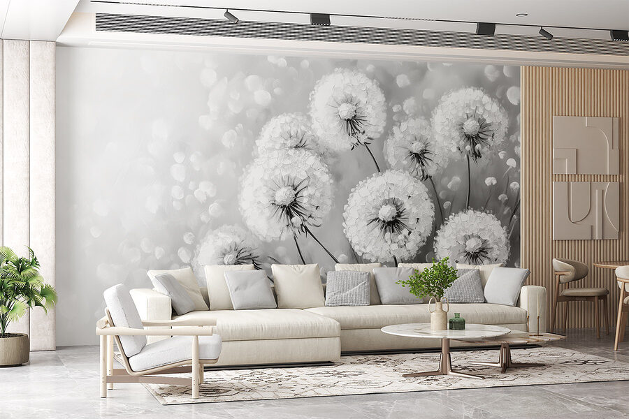 Představte si, že vejdete do místnosti a okamžitě vás přivítá vzdušná elegance rozkvetlých pampelišek – jenže tentokrát jsou v nápadné černobílé barvě. Tato nástěnná malba promění váš prostor v zasněné útočiště, kde se rozmar přírody snoubí s moderním stylem. Každá nadýchaná pampeliška působí, jako by byla připravena vzlétnout, a přináší pocit lehkosti a radosti. Představte si, jak zde popíjíte kávu, jste ztraceni v myšlenkách nebo pořádáte chatu, kde všichni nemohou neobdivovat krásu na stěnách. Je to jako mít nadčasové umělecké dílo, které šeptá příběhy o letním vánku a bezstarostných dnech, a přitom stále dodává vašemu domovu tu ohromně elegantní atmosféru. Ať už se jedná o útulný koutek nebo živý obývací prostor, tato nástěnná malba dokáže prostory správně vyladit. Ideální pro ty, kteří ocení dotek přírody bez rozruchu – vždyť kdo by neměl rád trochu květinového kouzla?