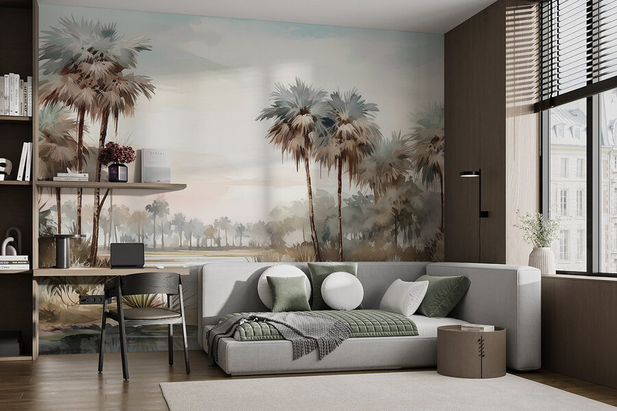 Proměňte svůj prostor pomocí této okouzlující nástěnné malby “Voda a palmy u řeky”. Představte si, že vejdete do místnosti, kde se nad klidnou řekou jemně pohupují svěží palmy, a přenesete tak kousek ráje přímo k vám domů. Měkké barvy a jemné tahy vytvářejí klidnou atmosféru – ideální pro snění nebo jen popíjení kávy a předstírání, že jste na pláži.
