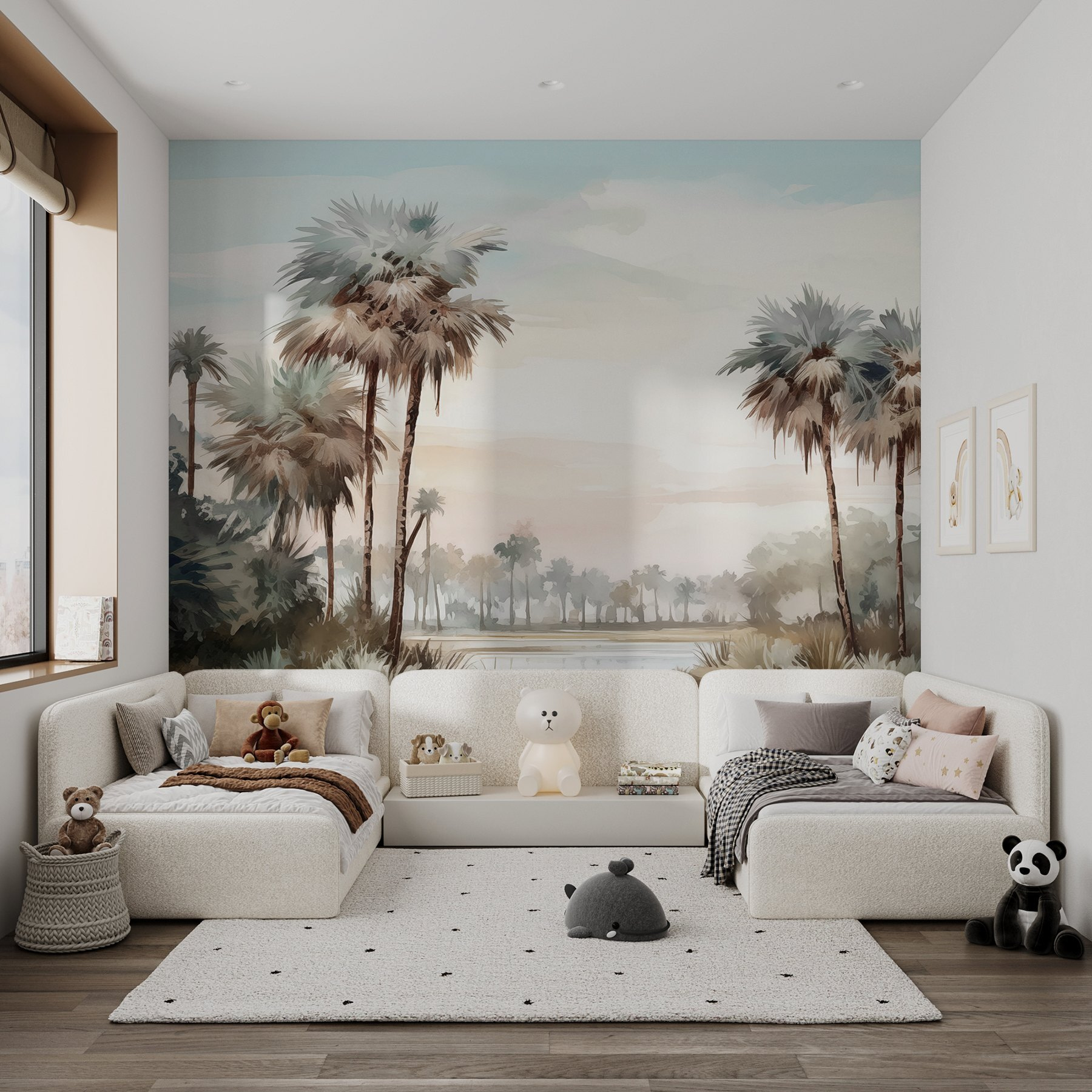 Proměňte svůj prostor pomocí této okouzlující nástěnné malby “Voda a palmy u řeky”. Představte si, že vejdete do místnosti, kde se nad klidnou řekou jemně pohupují svěží palmy, a přenesete tak kousek ráje přímo k vám domů. Měkké barvy a jemné tahy vytvářejí klidnou atmosféru – ideální pro snění nebo jen popíjení kávy a předstírání, že jste na pláži.