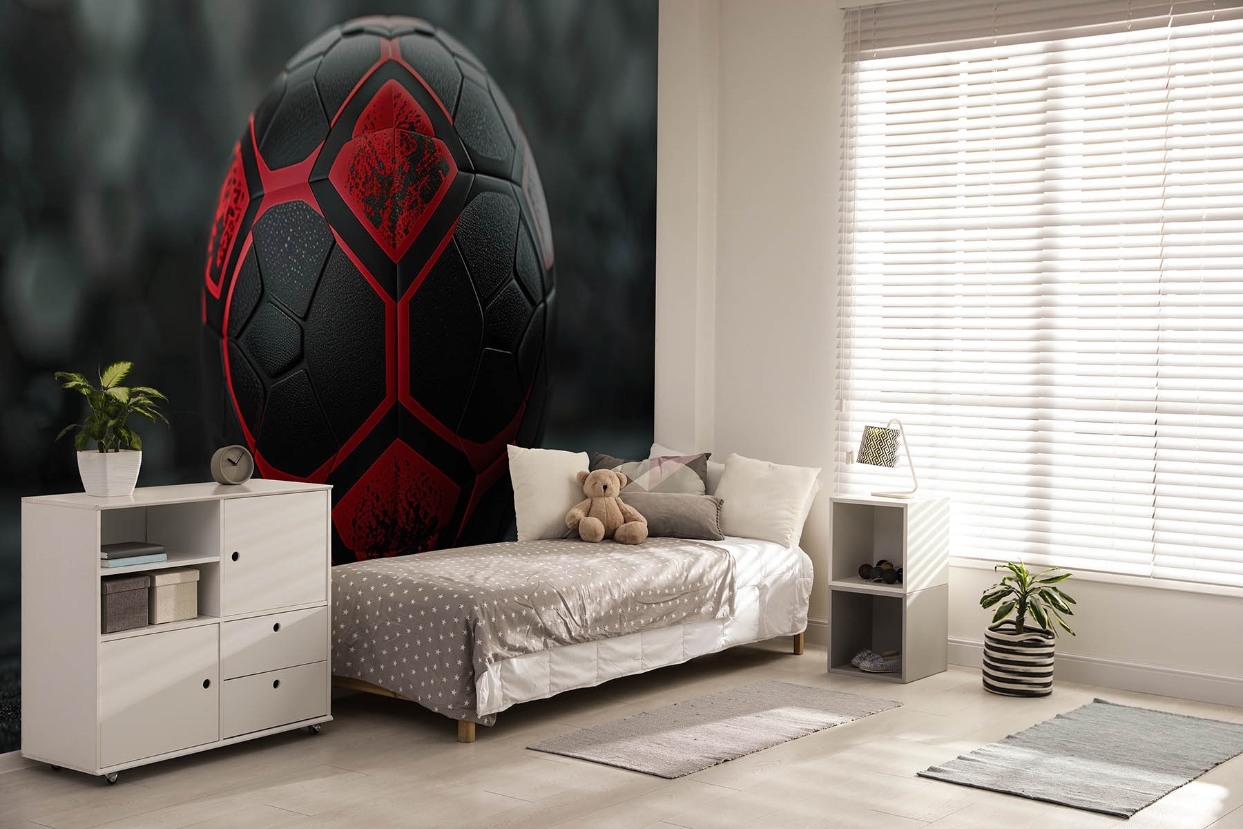Ponořte se do světa, kde se vaše stěny stanou zónou pro fanoušky, díky této výrazné fototapetě s černo-červeným fotbalovým míčem. Je to jako přenést miniaturní stadion přímo do vašeho obytného prostoru – samozřejmě bez přeplněných tribun a hot dogů. Tato fototapeta není jen dekorací, ale pozvánkou k prožití vzrušujících okamžiků zápasu přímo z vašeho gauče. Představte si to: přátelé se scházejí, občerstvení létá a někdo dramaticky přehrává gól v poslední minutě. Je to živé, odvážné a rozhodně to umí ukrást show. Ideální do ložnice, herny nebo kamkoli jinam, kde je potřeba přidat špetku vzrušení a přitakat krásné hře. Ať už jste náhodný divák, nebo zarytý fanoušek, tato nástěnná malba vyvolá konverzaci a úsměv pokaždé, když kolem vás někdo projde.