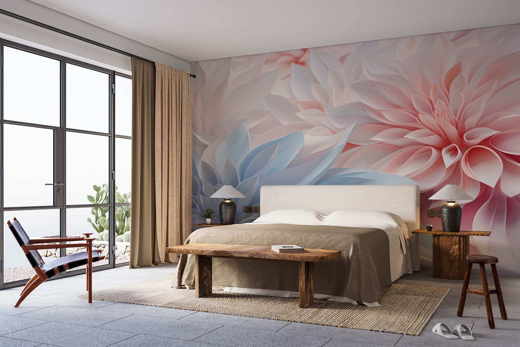 Proměňte svůj prostor pomocí této nádherné nástěnné malby s úžasným uspořádáním pastelových papírových květin. Představte si závan čerstvého vzduchu, který přináší – každý květ v jemné růžové a modré barvě působí jako jemné objetí jara. Perfektně se hodí do útulného zákoutí nebo živého obývacího pokoje, je to jako pozvat zahradu dovnitř bez starostí se zaléváním.