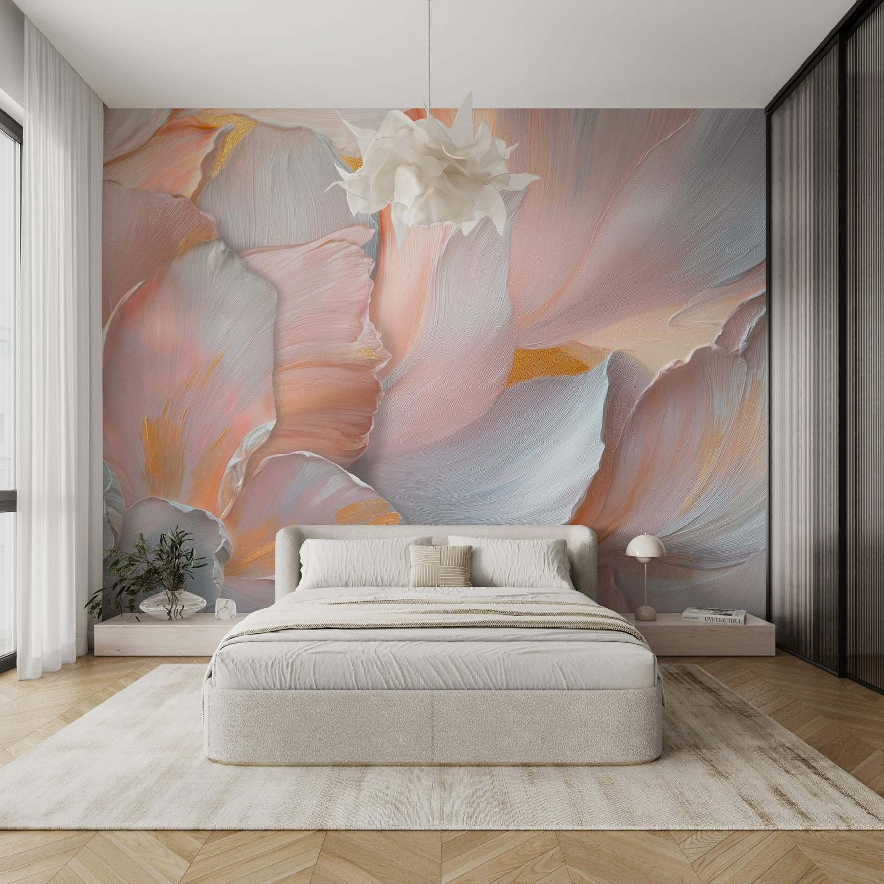 Proměňte každou místnost v oázu klidu pomocí nástěnné malby “Jemné okvětní lístky v jemných barvách”. Kdo by se nechtěl cítit jako v květinové říši divů? Jemné barvy vybízejí k útulné atmosféře, která je ideální pro líná odpoledne s knihou nebo živé povídání u kávy. Představte si, že popíjíte čaj a necháváte se pohltit jemnými, zasněnými okvětními lístky, z nichž každý tah šeptá příběh o kráse přírody. Je to jako mít zahradu, která nikdy neuvadne. Skvěle se hodí do klidného zákoutí nebo do živé chodby – je to začátek konverzace, únik, malý kousek klidu, který jen čeká, až ozdobí vaše stěny.